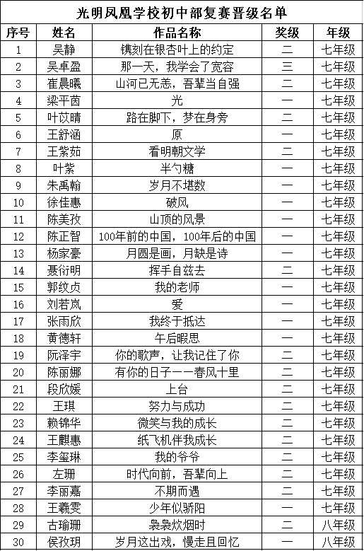 自2021年1月,活動征稿啟動以來,獲得了深圳市廣大中小學(xué)生、教師、文學(xué)愛好者的熱烈響應(yīng)積極參與,吸引了深圳百余所學(xué)校的上萬人關(guān)注報名?,F(xiàn)公布光明區(qū)鳳凰學(xué)校晉級復(fù)賽名單如下: