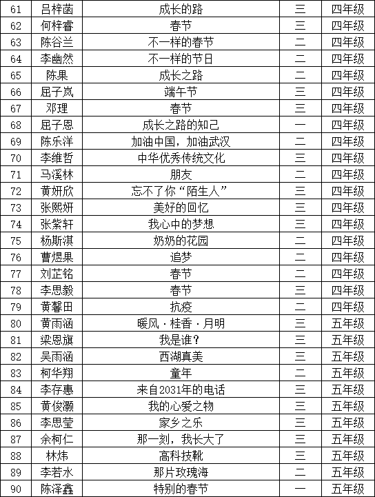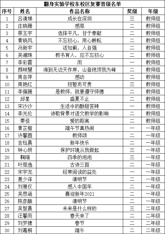 自2021年1月,活動(dòng)征稿啟動(dòng)以來,獲得了深圳市廣大中小學(xué)生、教師、文學(xué)愛好者的熱烈響應(yīng)積極參與,吸引了深圳百余所學(xué)校的上萬人關(guān)注報(bào)名?,F(xiàn)公布寶安區(qū)翻身實(shí)驗(yàn)學(xué)校(東校區(qū))晉級復(fù)賽名單如下: