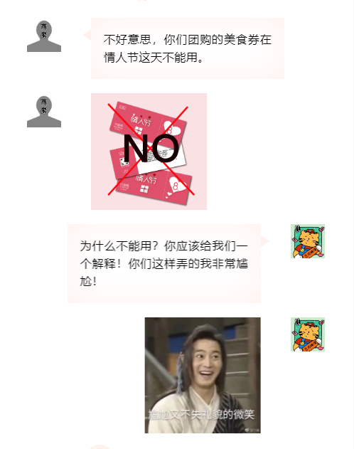 遇到春節(jié)、情人節(jié)等特殊時(shí)期,消費(fèi)者在團(tuán)購(gòu)時(shí)應(yīng)當(dāng)看清使用期限,如商家未提前說(shuō)明美食券的限用日期,而是去到現(xiàn)場(chǎng)才告知消費(fèi)者不能使用,則商家涉嫌侵害消費(fèi)者的知情權(quán)、公平交易權(quán)。如商家銷(xiāo)售美食券的頁(yè)面,注明情人節(jié)不能使用,此時(shí)商家盡到了提醒義務(wù),消費(fèi)者可在規(guī)定的其他時(shí)間內(nèi)使用美食券,或者向平臺(tái)申請(qǐng)退款。(消費(fèi)提示:消費(fèi)者購(gòu)買(mǎi)團(tuán)購(gòu)券時(shí),要仔細(xì)閱讀團(tuán)購(gòu)頁(yè)面的使用說(shuō)明,特別是要仔細(xì)瀏覽團(tuán)購(gòu)券使用時(shí)限。限用人數(shù)等具體內(nèi)容,避免遭遇買(mǎi)了卻用不了的困境。)