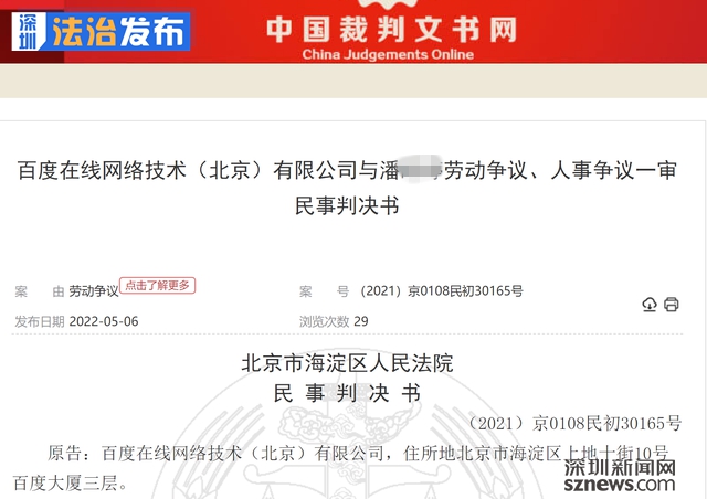 讀特客戶端·深圳新聞網(wǎng)2022年5月12日訊(記者 張玲 翁任瑩 實習(xí)生 趙薇)5月6日,中國裁判文書網(wǎng)披露的一起案件顯示,百度公司前員工潘某某離職后入職字節(jié)跳動,被百度告上法庭,理由是違反競業(yè)限制義務(wù)。北京市海淀區(qū)人民法院最終判決潘某返還百度公司為其支付的競業(yè)限制補償金214800元,同時判決潘某某向百度公司支付競業(yè)限制違約金859200元,繼續(xù)履行對百度公司的保密義務(wù)。