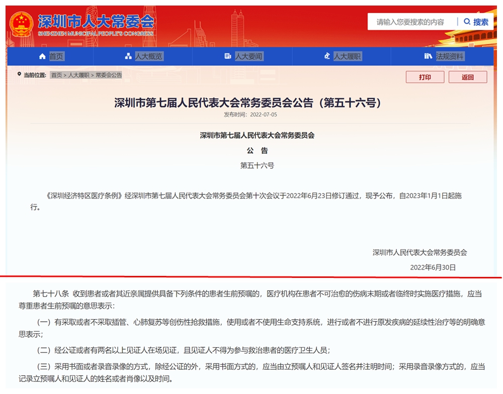 深圳市人大常委會(huì)官網(wǎng)頁面截圖及《深圳經(jīng)濟(jì)特區(qū)醫(yī)療條例》第七十八條內(nèi)容。