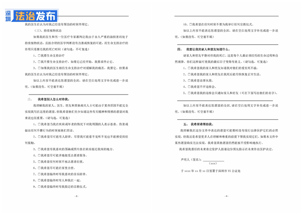 除了生前預(yù)囑的3種情況外,杜芹律師公證的這份聲明書,包含5個(gè)愿望清單①我要或不要什么醫(yī)療服務(wù)②我希望使用或者不使用生命支持治療③我希望別人怎么對(duì)待我④我想讓我的家人和朋友知道什么⑤我希望誰幫助我。