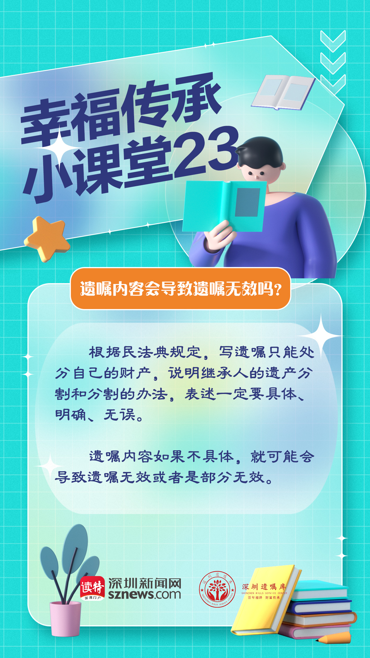 今天,由深圳遺囑庫與深圳新聞網(wǎng)聯(lián)合制作的幸福傳承小課堂第23期,我們就來說說,遺囑什么情況下可能無效。根據(jù)民法典規(guī)定,寫遺囑只能處分自己的財產(chǎn),說明繼承人的遺產(chǎn)分割和分割的辦法,表述一定要具體、明確、無誤。遺囑內(nèi)容如果不具體,就可能會導(dǎo)致遺囑無效或者是部分無效。因此,李大爺不能將財產(chǎn)的全部都給到后老伴,法院也判定了這份遺囑是部分無效的。