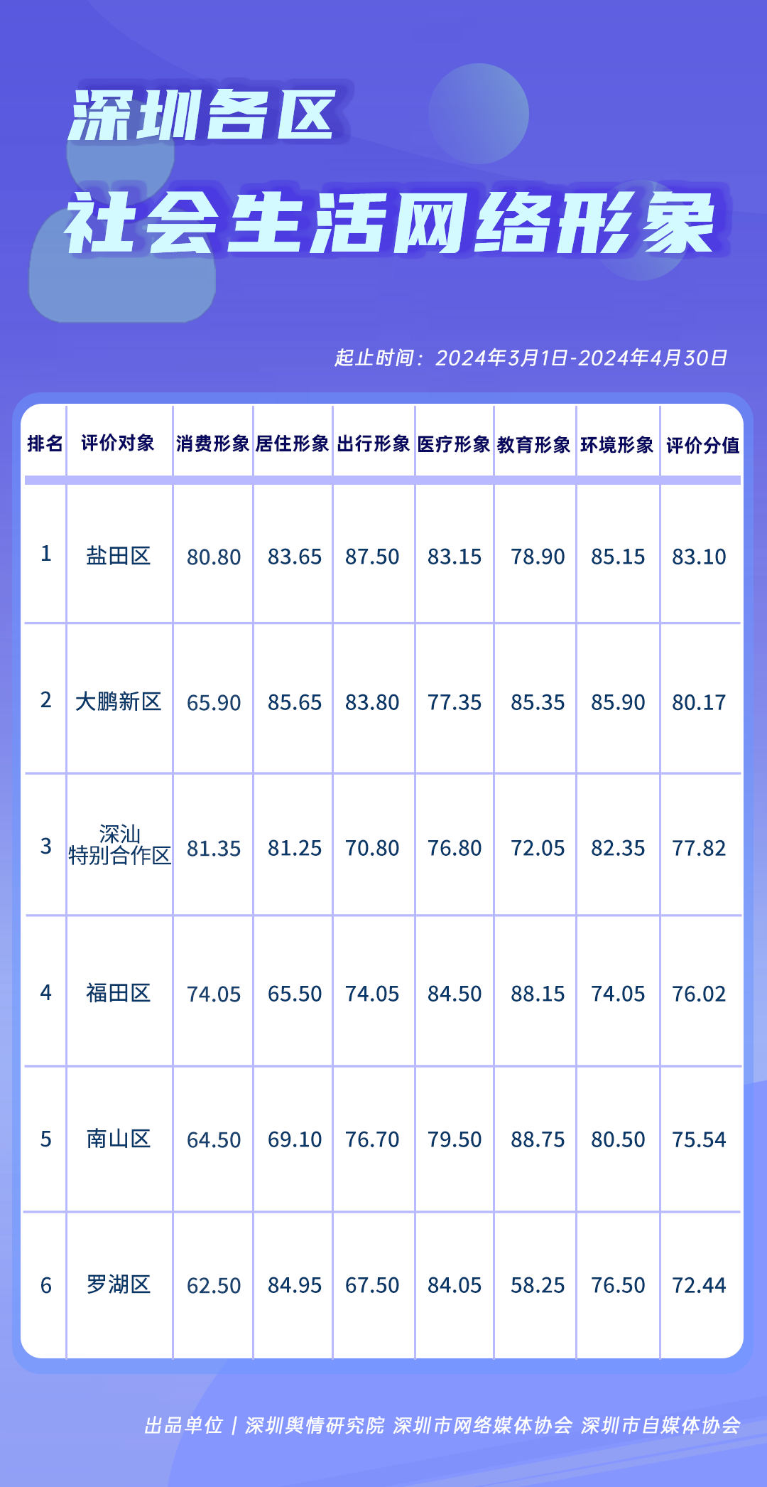 3-4月《深圳各區(qū)社會(huì)生活網(wǎng)絡(luò)形象榜》顯示,位居榜單第一名的鹽田區(qū),評(píng)價(jià)分值為83.10分,且消費(fèi)、居住、出行、醫(yī)療和環(huán)境形象方面均高于80分,整體社會(huì)生活網(wǎng)絡(luò)形象較佳。緊隨其后的大鵬新區(qū)在居住、教育和環(huán)境形象建設(shè)方面,取得的分?jǐn)?shù)都高于85分,表明該區(qū)在打造優(yōu)美宜居生活環(huán)境過程中收獲了較好反饋。位列第三的深汕特別合作區(qū),在消費(fèi)、居住、環(huán)境形象方面表現(xiàn)也相對(duì)較好,得分均在80分以上,助推其社會(huì)生活網(wǎng)絡(luò)形象綜合得分走高。福田區(qū)、南山區(qū)、羅湖區(qū)分別占據(jù)了榜單第四,第五和第六的位置,評(píng)價(jià)分值依次為76.02分、75.54分、72.44分,綜合水平良好,后續(xù)若能充分發(fā)揮優(yōu)勢,著力補(bǔ)齊短板,排名有望持續(xù)提升。