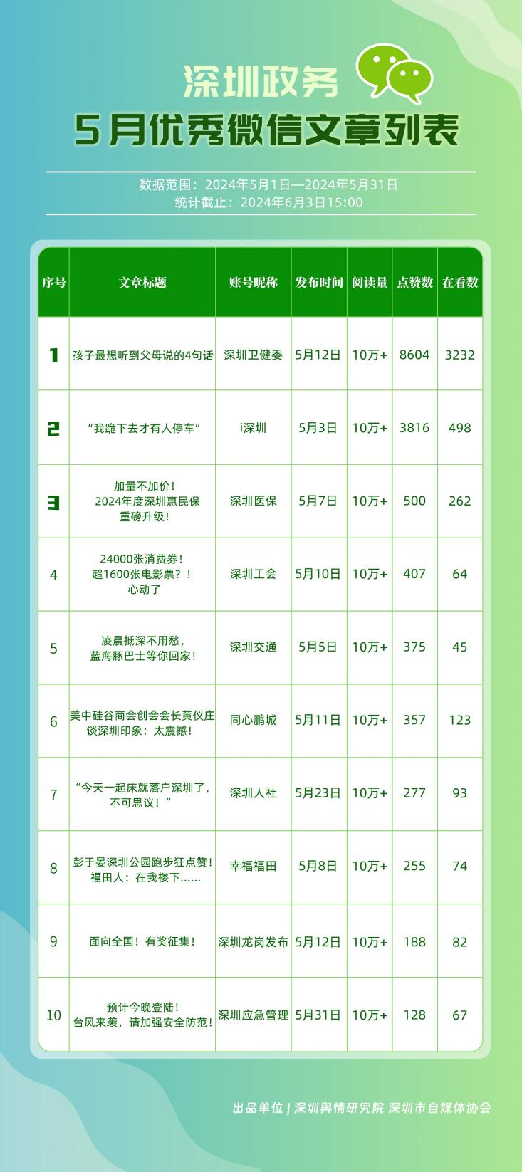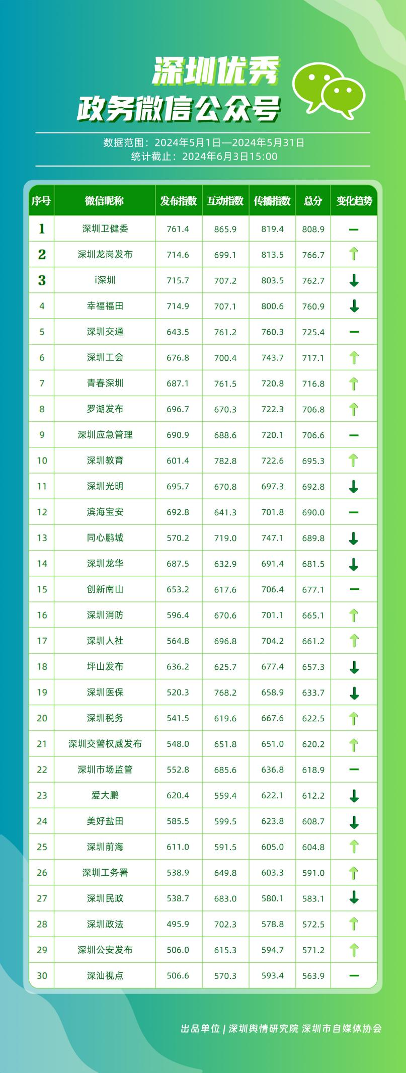 5月,“深圳衛(wèi)健委”“深圳龍崗發(fā)布”“i深圳”“幸福福田”“深圳交通”“深圳工會”“青春深圳”“羅湖發(fā)布”“深圳應(yīng)急管理”“深圳教育”等30個政務(wù)微信公眾號,被評為“深圳優(yōu)秀政務(wù)微信公眾號”。5月,“深圳衛(wèi)健委”憑借精心創(chuàng)作的內(nèi)容、與受眾深入互動,多篇作品深受好評,榮登榜單首位?!吧钲邶垗彴l(fā)布”“i深圳”“幸福福田”“深圳交通”等上榜公眾號也積極捕捉觀眾優(yōu)質(zhì)作品需求,把握主流熱點趨勢,集中發(fā)揮政務(wù)媒體傳播力量,在本期也取得了較為亮眼的成績,進一步推動了政務(wù)信息傳播工作提質(zhì)增效。