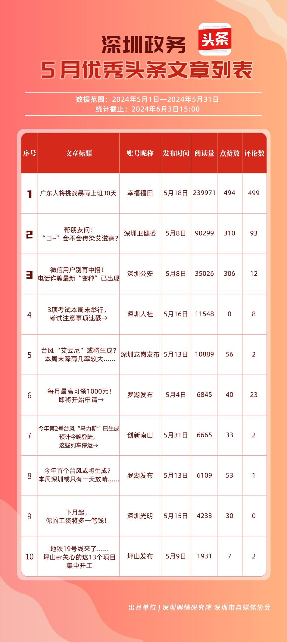 5月,“幸福福田”“深圳龍崗發(fā)布”“深圳衛(wèi)健委”“深圳龍華”“深圳公安”“創(chuàng)新南山”“深圳光明”“羅湖發(fā)布”“深圳人社”“坪山發(fā)布”共10個政務(wù)頭條號能夠及時發(fā)布政務(wù)信息及公共服務(wù)信息,服務(wù)經(jīng)濟社會發(fā)展,滿足公眾信息需求,位列“優(yōu)秀政務(wù)頭條號”榜單,《廣東人將挑戰(zhàn)暴雨上班30天》《幫朋友問:“口~”會不會傳染艾滋?。俊返葍?yōu)秀文章資訊深入人心。其他未上榜單位應(yīng)積極運用該新媒體平臺助力政務(wù)公開,讓權(quán)威聲音有效傳播到目標(biāo)受眾,更好地服務(wù)人民群眾。