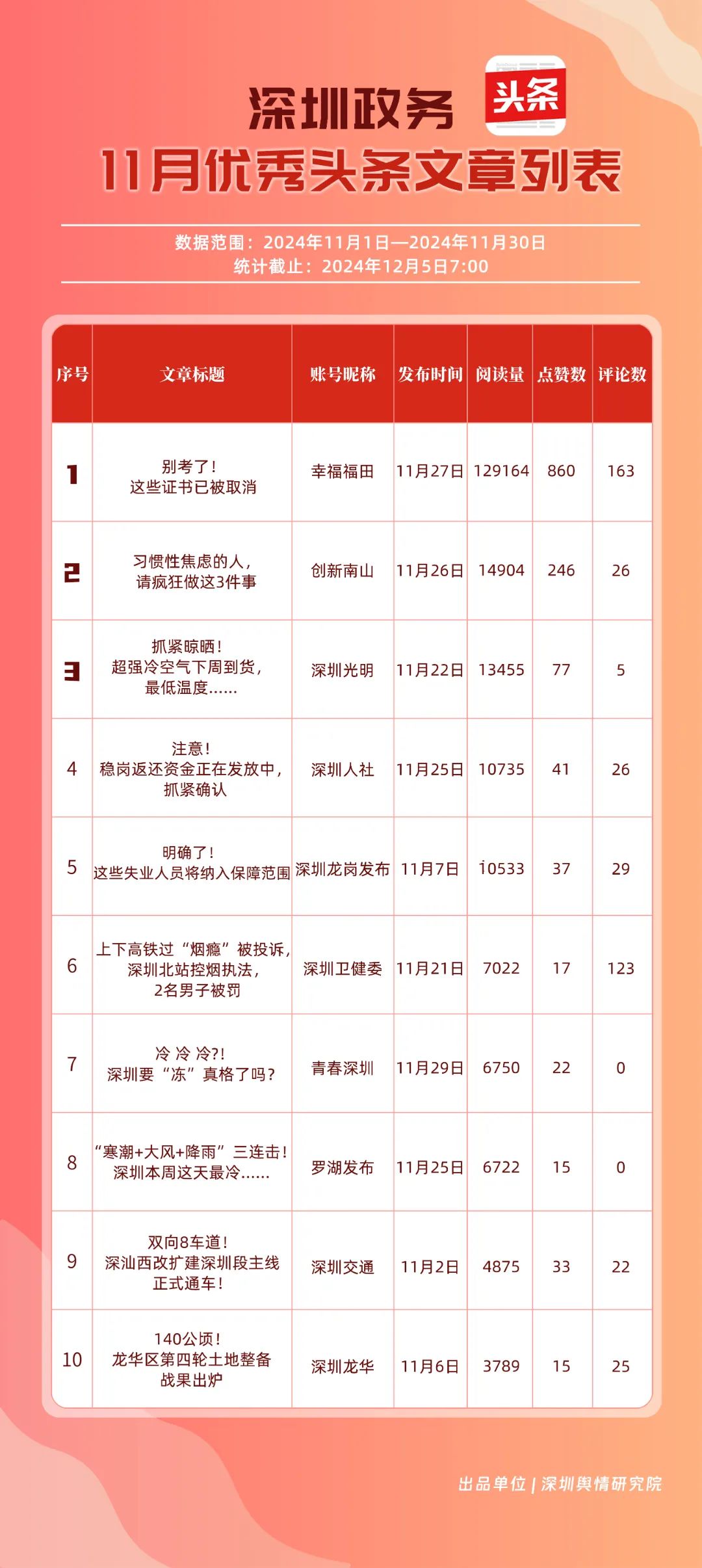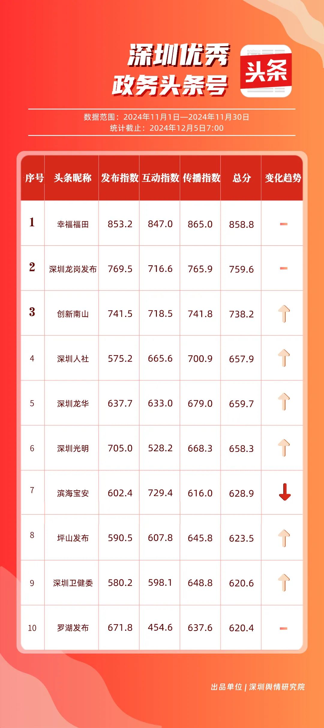 11月,“幸福福田”“深圳龍崗發(fā)布”“創(chuàng)新南山”“深圳人社”“深圳龍華”“深圳光明”“濱海寶安”“坪山發(fā)布”“深圳衛(wèi)健委”“羅湖發(fā)布”共10個政務(wù)頭條號入選“優(yōu)秀政務(wù)頭條號”榜單?!靶腋8L铩卑l(fā)布大量民生相關(guān)信息,穩(wěn)居第一?!吧钲邶垗彴l(fā)布”同樣表現(xiàn)不凡,排名始終位于前列,展現(xiàn)了其在信息傳播與政務(wù)服務(wù)方面的卓越能力。此外,賬號“創(chuàng)新南山”“深圳人社”“深圳龍華”“深圳光明”在榜單中的排名有所提升,為政務(wù)新媒體樹立了典范。