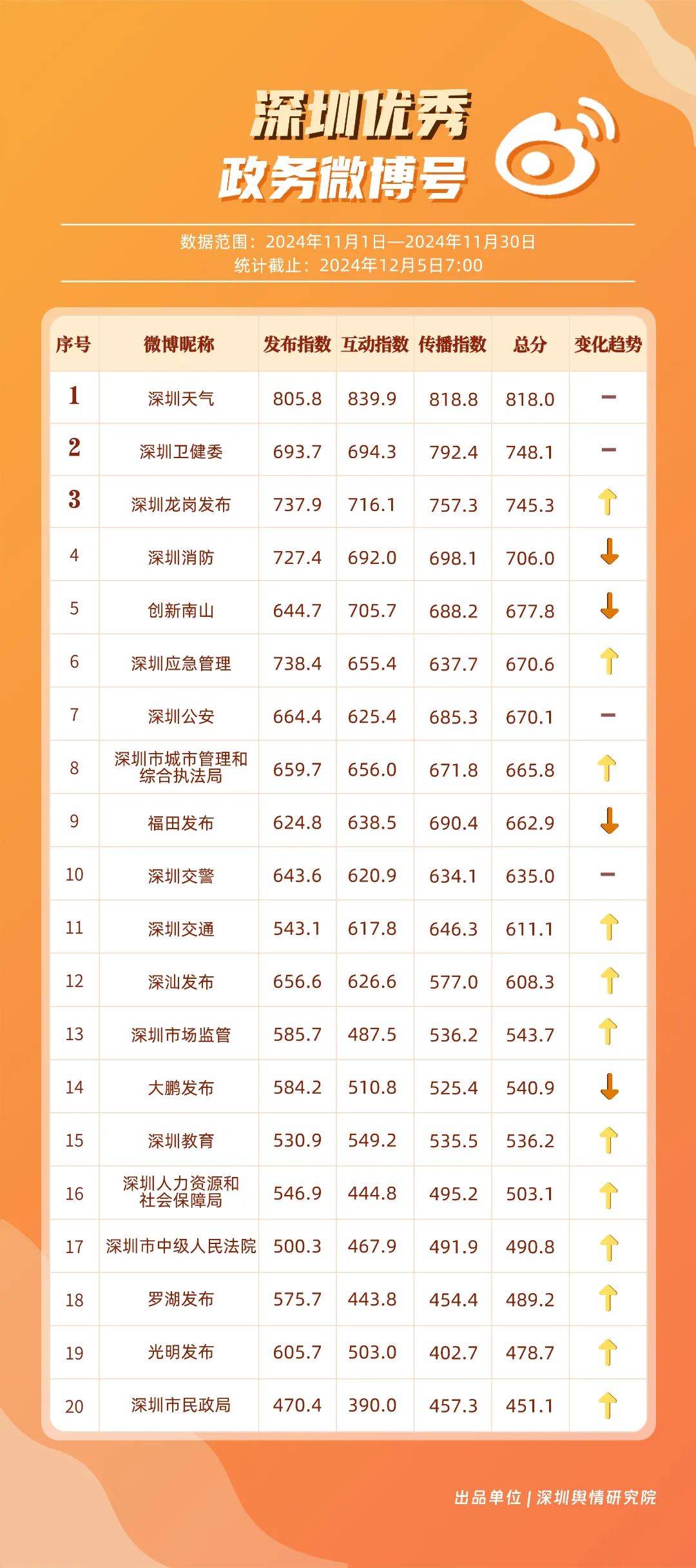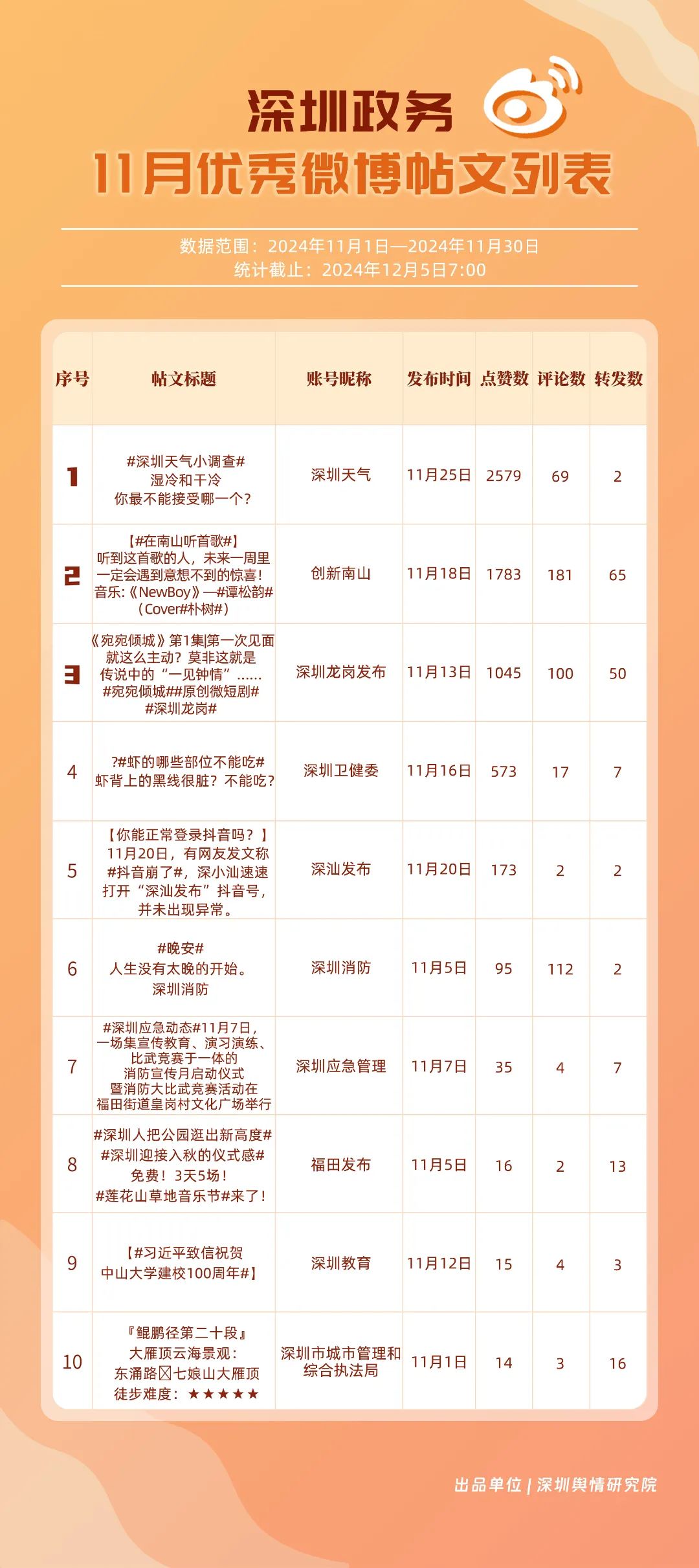 11月,“深圳天氣”“深圳衛(wèi)健委”“深圳龍崗發(fā)布”“深圳消防”“創(chuàng)新南山”“深圳應(yīng)急管理”“深圳公安”“深圳市城市管理和綜合執(zhí)法局”“福田發(fā)布”“深圳交警”等20個賬號入選“優(yōu)秀政務(wù)微博號”?!吧钲谔鞖狻薄吧钲谛l(wèi)健委”賬號在信息傳播上不斷精進(jìn),為市民帶來及時、優(yōu)質(zhì)且高效的資訊,內(nèi)容緊貼民生,贏得了市民的廣泛贊譽,排名穩(wěn)定在前2名。同時,“深圳龍崗發(fā)布”“深圳消防”和“創(chuàng)新南山”等賬號也能夠精準(zhǔn)滿足市民的信息需求,并在此基礎(chǔ)上提升市民閱讀體驗,推動了其在榜單上的穩(wěn)步提升,彰顯了政務(wù)微博的創(chuàng)新活力與社會價值。