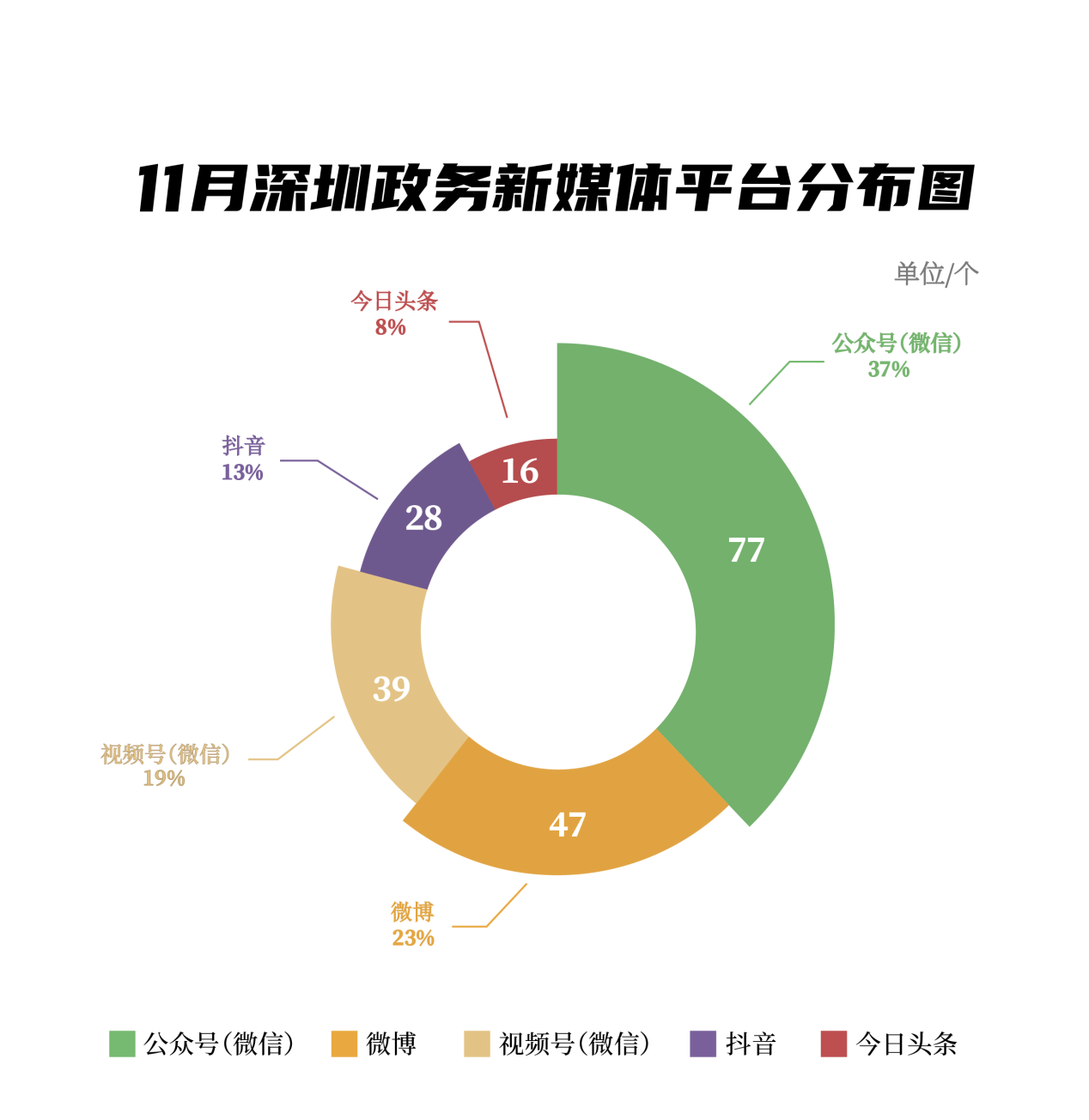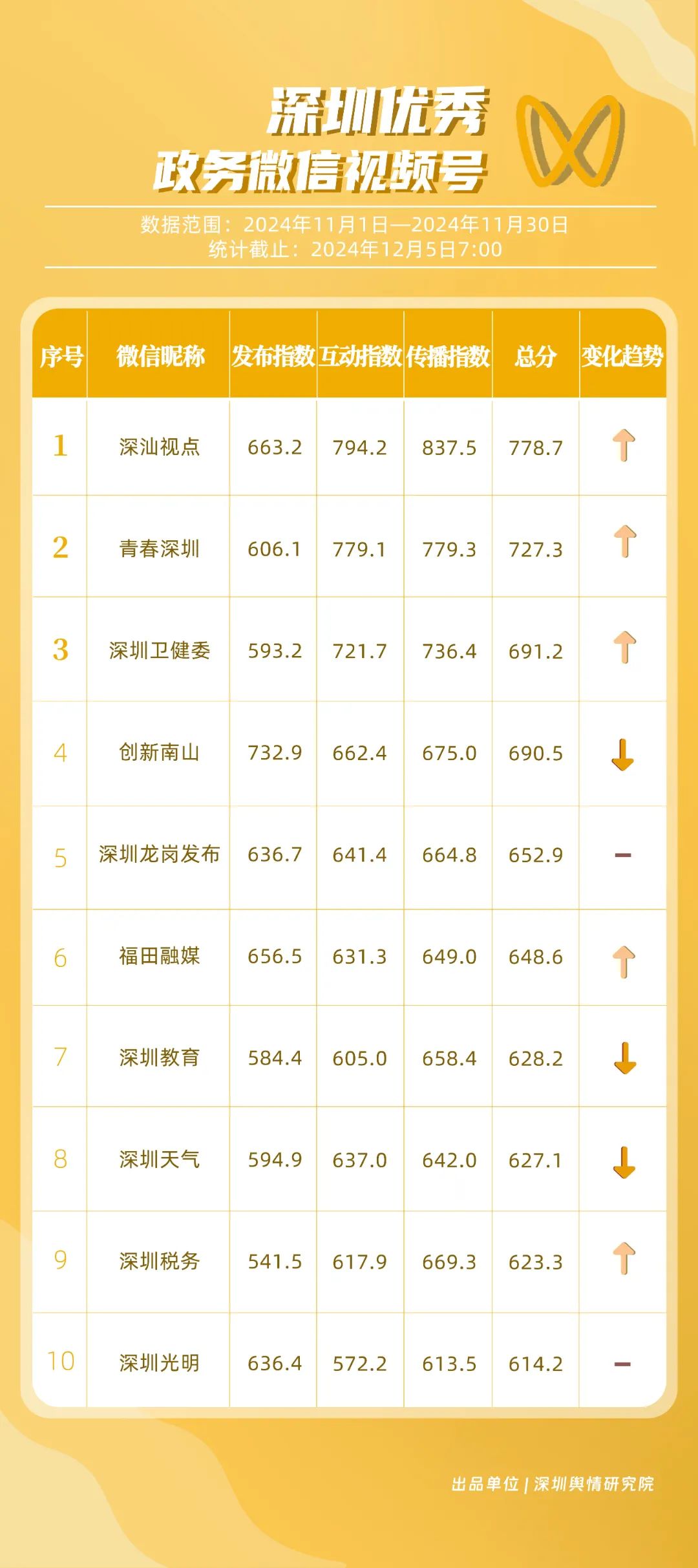 《深圳優(yōu)秀政務(wù)新媒體矩陣》將深圳黨政機關(guān)、企事業(yè)單位開設(shè)的政務(wù)公眾號(微信)、微博號、抖音號、視頻號(微信)及頭條號按照發(fā)布指數(shù)、互動指數(shù)、傳播指數(shù)三項指標(biāo)進(jìn)行綜合評價,最終形成優(yōu)秀名單。