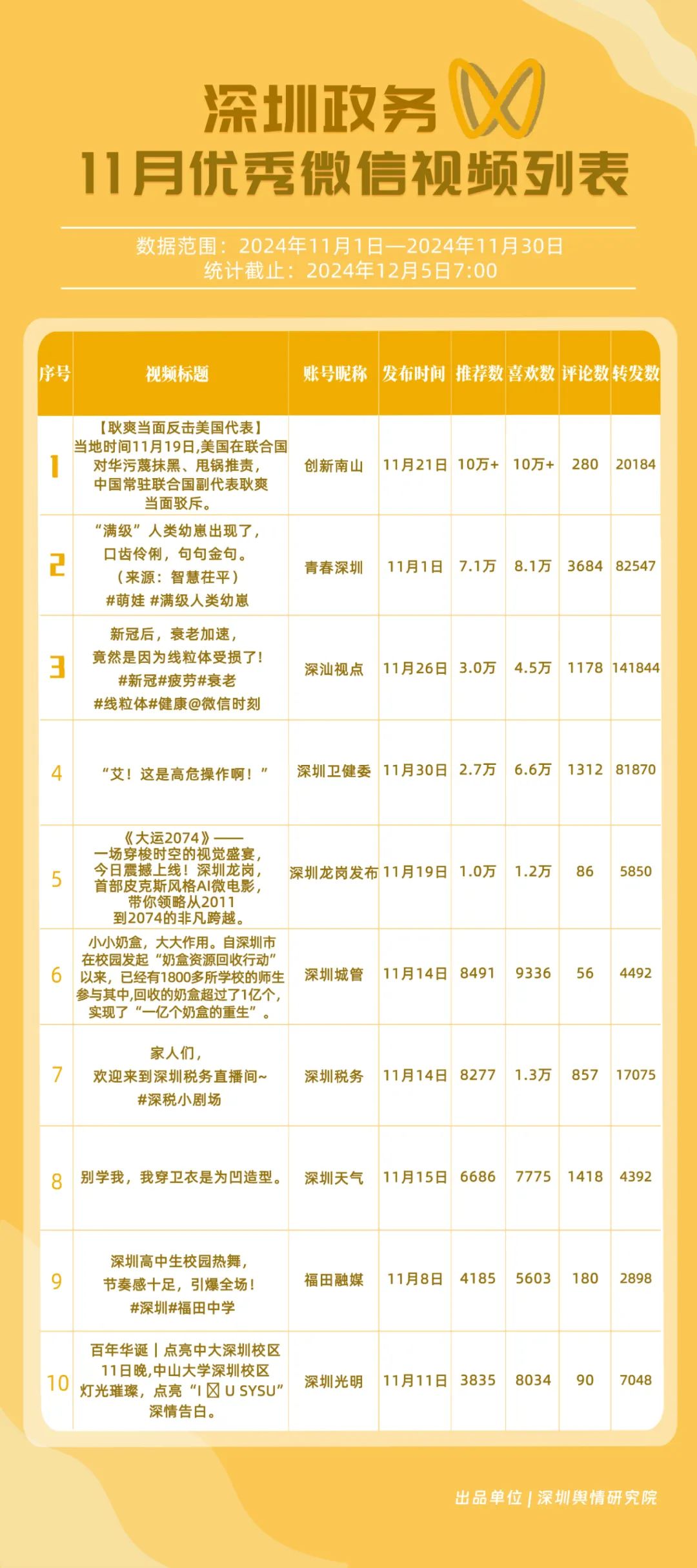 11月,獲“深圳優(yōu)秀政務(wù)微信視頻號”稱號的分別是“深汕視點”“青春深圳”“深圳衛(wèi)健委”“創(chuàng)新南山”“深圳龍崗發(fā)布”“福田融媒”“深圳教育”“深圳天氣”“深圳稅務(wù)”“深圳光明”。其中,“深汕視點”與“青春深圳”通過積極轉(zhuǎn)發(fā)涵蓋廣泛領(lǐng)域的優(yōu)質(zhì)視頻內(nèi)容,贏得了網(wǎng)民的廣泛點贊與推薦,彰顯了其在內(nèi)容聚合與傳播上的獨到之處。“深圳衛(wèi)健委”則專注于衛(wèi)生健康領(lǐng)域,發(fā)布了一系列高質(zhì)量的內(nèi)容,深受網(wǎng)民喜愛,進(jìn)一步鞏固了其在健康傳播領(lǐng)域的領(lǐng)先地位。