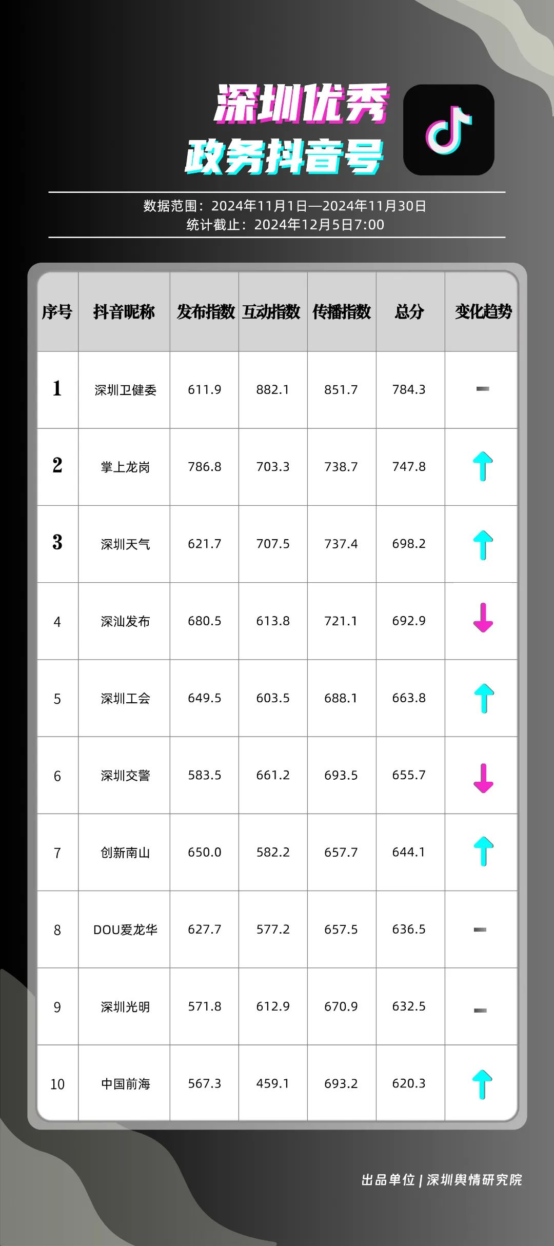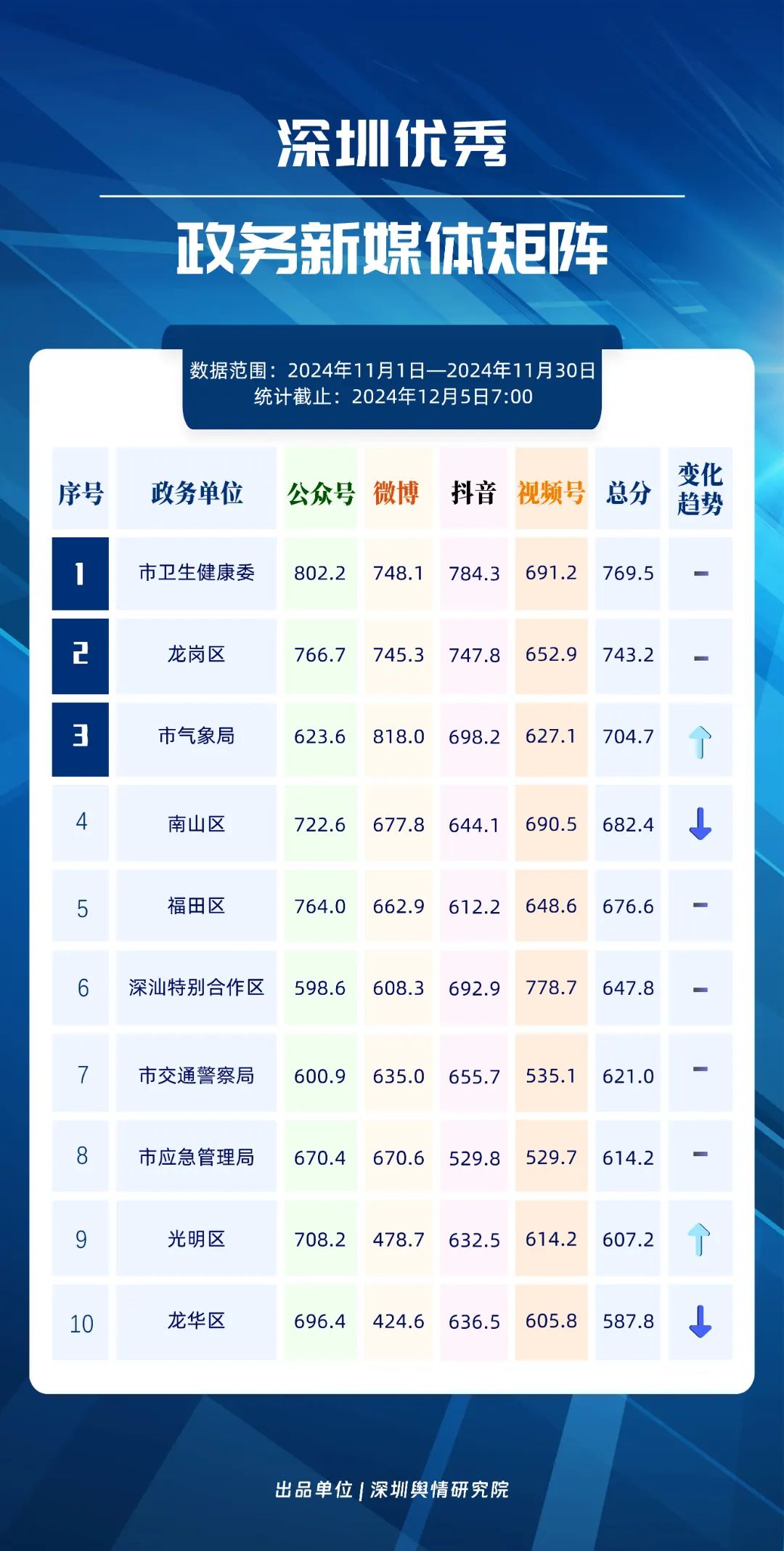 11月,市衛(wèi)生健康委、龍崗區(qū)、市氣象局、南山區(qū)、福田區(qū)、深汕特別合作區(qū)、市交通警察局、市應(yīng)急管理局、光明區(qū)、龍華區(qū)榮登“深圳優(yōu)秀政務(wù)新媒體矩陣”榜單。11月,市衛(wèi)生健康委新媒體矩陣持續(xù)深耕衛(wèi)生健康領(lǐng)域,穩(wěn)固占據(jù)榜單首位。龍崗區(qū)新媒體矩陣則在多平臺發(fā)布《宛宛傾城》這一劇情類視頻,展現(xiàn)了其在內(nèi)容創(chuàng)新上的積極探索。市氣象局新媒體矩陣則以多樣化的天氣播報形式,贏得了廣泛好評,位列榜單第三名。同時,南山區(qū)、福田區(qū)、深汕特別合作區(qū)等新媒體矩陣在各平臺展現(xiàn)出不凡實力,憑借各自優(yōu)勢與精彩的內(nèi)容,在《深圳優(yōu)秀政務(wù)新媒體矩陣》榜單中取得靠前名次。