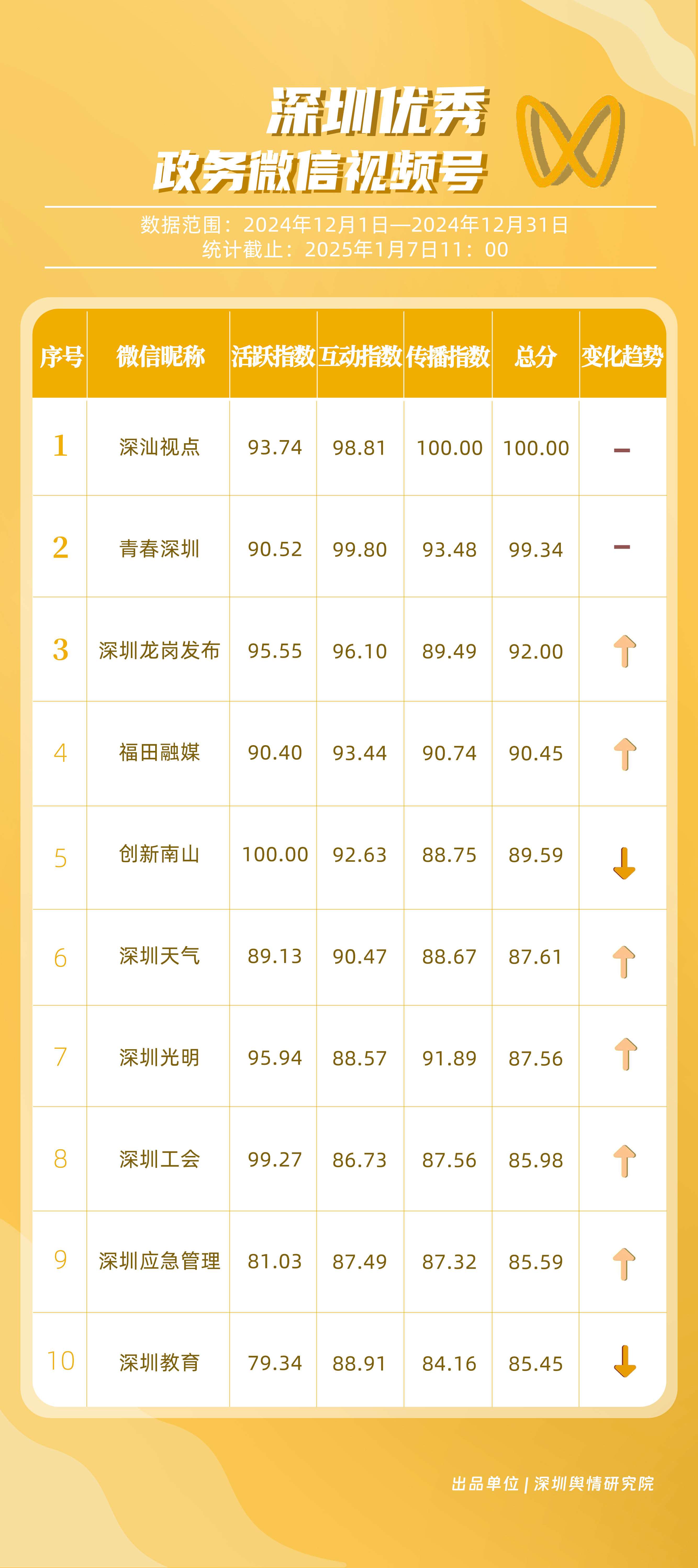 12月,獲“深圳優(yōu)秀政務(wù)微信視頻號(hào)”稱(chēng)號(hào)的分別是“深汕視點(diǎn)”“青春深圳”“深圳龍崗發(fā)布”“福田融媒”“創(chuàng)新南山”“深圳天氣”“深圳光明”“深圳工會(huì)”“深圳應(yīng)急管理”“深圳教育”。其中,“深汕視點(diǎn)”“青春深圳”在互動(dòng)方面表現(xiàn)突出,占據(jù)榜單第一、第二位置?!吧钲邶垗彴l(fā)布”活躍、互動(dòng)指數(shù)位于各政務(wù)視頻號(hào)前列,排名有所提升。“福田融媒”三大指標(biāo)得分均在90分以上,位于榜單第四名,充分展現(xiàn)各政務(wù)微信視頻號(hào)在信息更新、用戶(hù)互動(dòng)以及傳播范圍等方面的卓越能力和持續(xù)進(jìn)步。