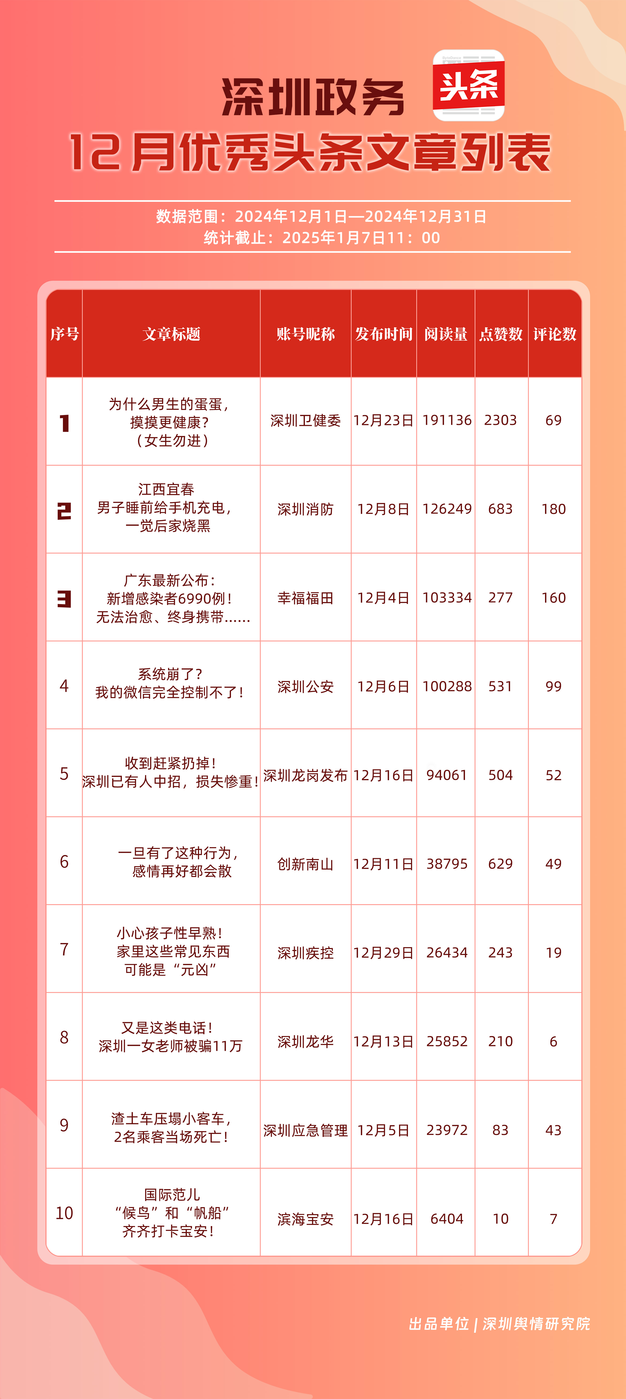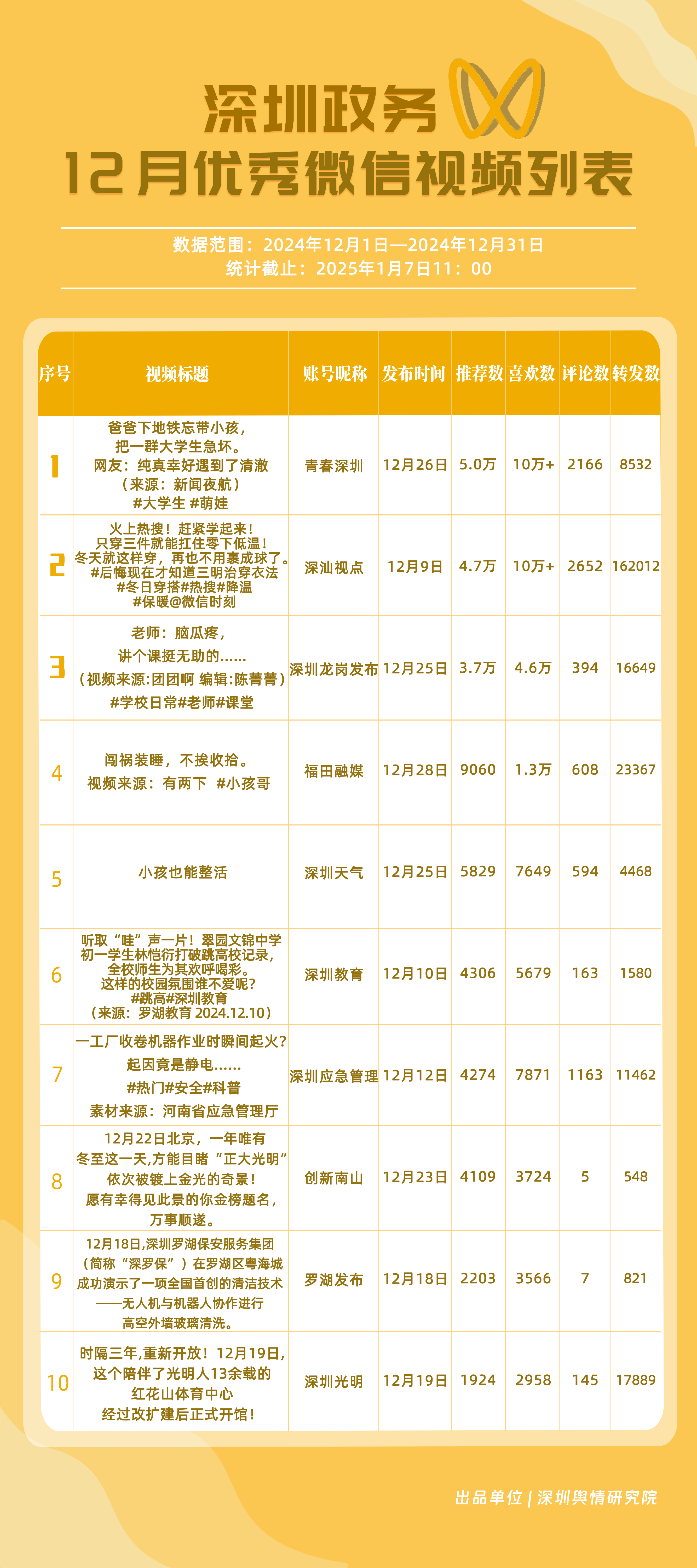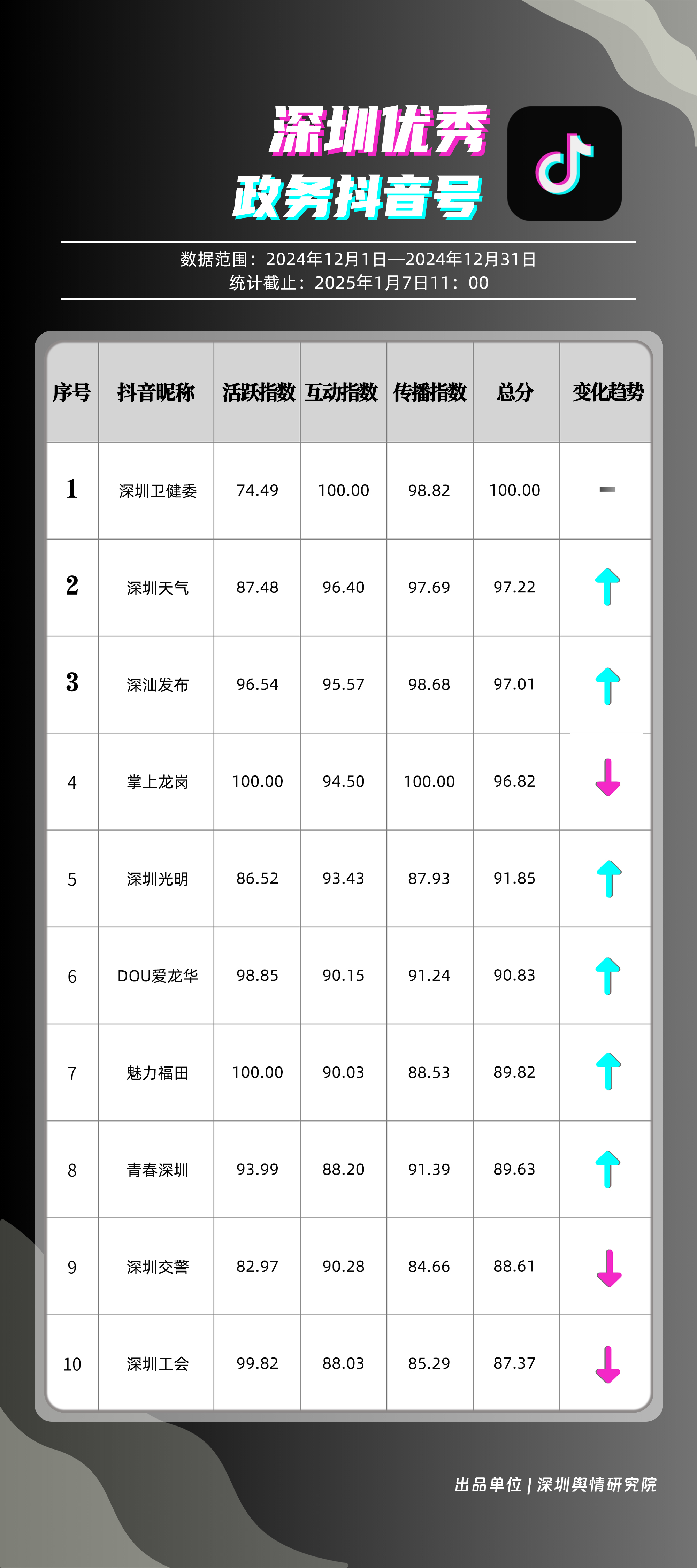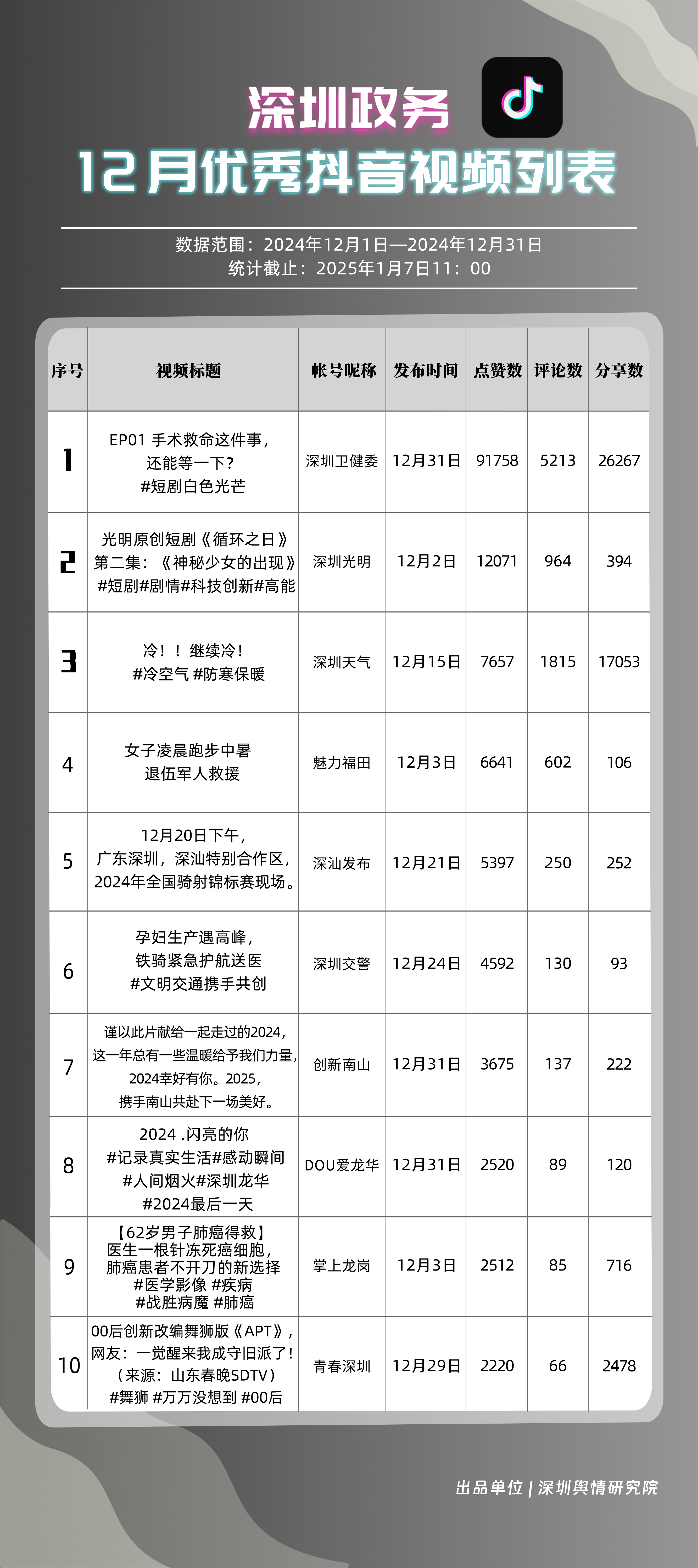 12月,“深圳衛(wèi)健委”“深圳天氣”“深汕發(fā)布”“掌上龍崗”“深圳光明”“DOU愛(ài)龍華”“魅力福田”“青春深圳”“深圳交警”“深圳工會(huì)”共10個(gè)政務(wù)抖音號(hào)獲得“深圳優(yōu)秀政務(wù)抖音號(hào)”稱(chēng)號(hào)?!吧钲谛l(wèi)健委”在互動(dòng)、傳播方面成績(jī)優(yōu)異,助推其位于榜單首位。“深圳天氣”“深汕發(fā)布”“掌上龍崗”則各有所長(zhǎng),綜合排名位于榜單前列,內(nèi)容產(chǎn)出豐富、用戶(hù)互動(dòng)高頻,信息傳播廣泛,共同展現(xiàn)了政務(wù)抖音號(hào)在服務(wù)公眾、提升信息傳播效能方面的顯著效能。