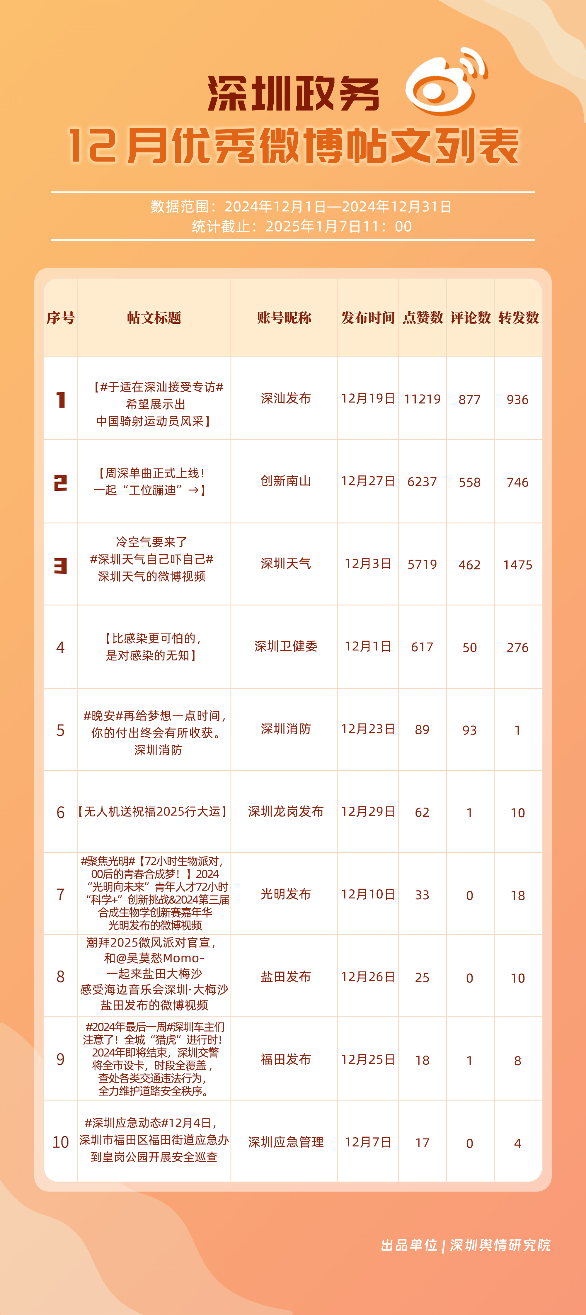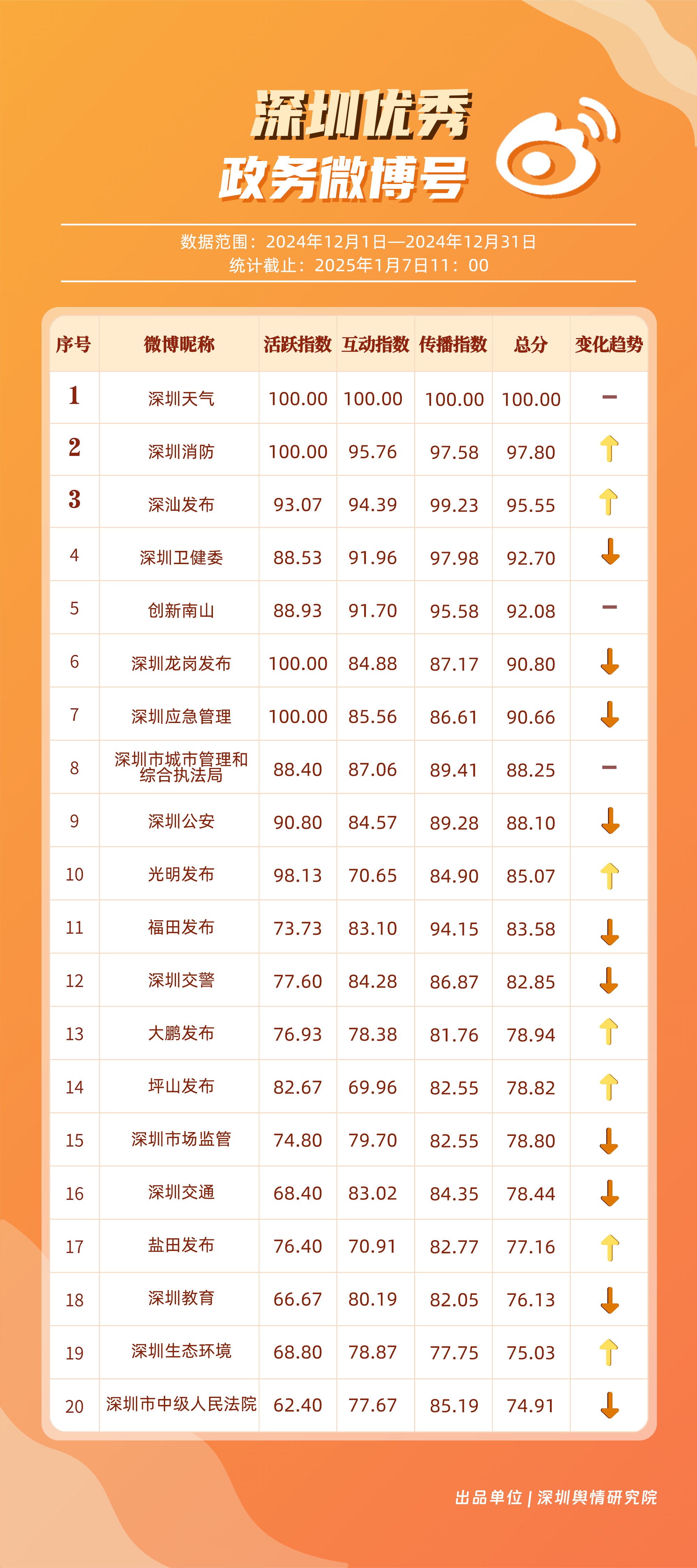 12月,“深圳天氣”“深圳消防”“深汕發(fā)布”“深圳衛(wèi)健委”“創(chuàng)新南山”“深圳龍崗發(fā)布”“深圳應(yīng)急管理”“深圳市城市管理和綜合執(zhí)法局”“深圳公安”“光明發(fā)布”等20個(gè)賬號(hào)入選“優(yōu)秀政務(wù)微博號(hào)”。“深圳天氣”獲得滿(mǎn)分,“深圳消防”“深汕發(fā)布”賬號(hào)總分均超95分,位于榜單前三名。同時(shí),“深圳衛(wèi)健委”“創(chuàng)新南山”“深圳龍崗發(fā)布”及“深圳應(yīng)急管理”等賬號(hào)憑借對(duì)熱點(diǎn)的敏銳捕捉與信息的及時(shí)發(fā)布,總分在90分以上,體現(xiàn)出各自在提升公眾信息獲取質(zhì)量方面的不懈努力,彰顯了政務(wù)微博賬號(hào)在政民連接、信息共享等方面的巨大價(jià)值。