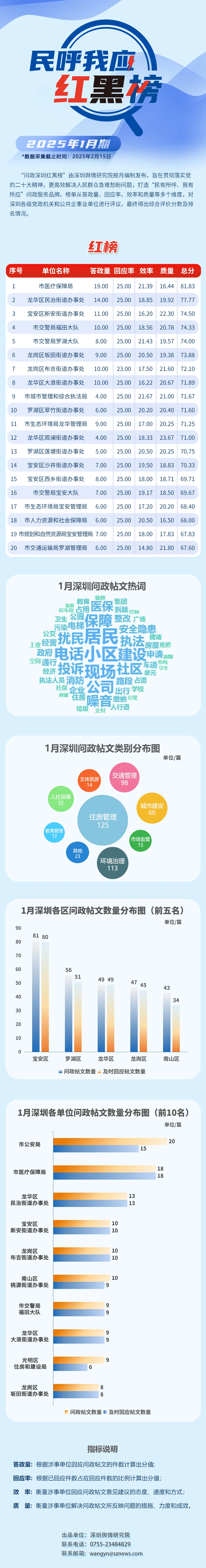 2025年1月,共有20家單位因積極解決民生問(wèn)題,認(rèn)真細(xì)致答政,登上“紅榜”,它們分別是:市醫(yī)療保障局、龍華區(qū)民治街道辦事處、寶安區(qū)新安街道辦事處、市交警局福田大隊(duì)、市交警局羅湖大隊(duì)、龍崗區(qū)坂田街道辦事處、龍崗區(qū)布吉街道辦事處、龍華區(qū)大浪街道辦事處、市城市管理和綜合執(zhí)法局、羅湖區(qū)翠竹街道辦事處、市生態(tài)環(huán)境局龍華管理局、龍華區(qū)觀瀾街道辦事處、羅湖區(qū)蓮塘街道辦事處、寶安區(qū)沙井街道辦事處、寶安區(qū)西鄉(xiāng)街道辦事處、市交警局寶安大隊(duì)、市生態(tài)環(huán)境局寶安管理局、市人力資源和社會(huì)保障局、市規(guī)劃和自然資源局寶安管理局、市交通運(yùn)輸局羅湖管理局。