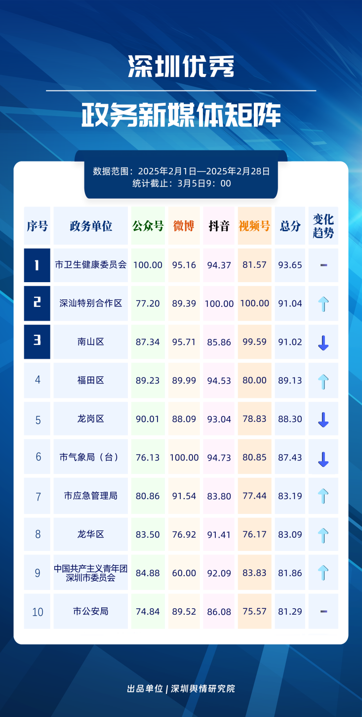 2月,市衛(wèi)生健康委、深汕特別合作區(qū)、南山區(qū)、福田區(qū)、龍崗區(qū)、市氣象局、市應(yīng)急管理局、龍華區(qū)、中國(guó)共產(chǎn)主義青年團(tuán)深圳市委員會(huì)、市公安局榮登“深圳優(yōu)秀政務(wù)新媒體矩陣”榜單。2月,市衛(wèi)生健康委賬號(hào)運(yùn)營(yíng)成績(jī)亮眼,微信公眾號(hào)平臺(tái)閱讀量破10萬次的文章超60篇;深汕特別合作區(qū)新媒體矩陣緊抓網(wǎng)絡(luò)熱點(diǎn),作品吸引力顯著;南山區(qū)新媒體矩陣則持續(xù)發(fā)力宣傳,其微博號(hào)、頭條號(hào)在對(duì)應(yīng)平臺(tái)榜單中居于前二位置。以上賬號(hào)在“深圳優(yōu)秀政務(wù)新媒體矩陣”榜單中榮獲前三名。此外,福田區(qū)新媒體矩陣深耕短視頻領(lǐng)域與今日頭條平臺(tái),位于“深圳優(yōu)秀政務(wù)新媒體矩陣”第四名,彰顯出優(yōu)秀的內(nèi)容產(chǎn)出能力;龍崗區(qū)新媒體矩陣的抖音號(hào)分?jǐn)?shù)超93分,反映其在視頻制作方面的良苦用心,不斷提升內(nèi)容傳播價(jià)值;市氣象局新媒體矩陣則在微博、抖音平臺(tái)持續(xù)創(chuàng)新氣象領(lǐng)域內(nèi)容,打造“趣味科普+民生服務(wù)”雙驅(qū)模式。