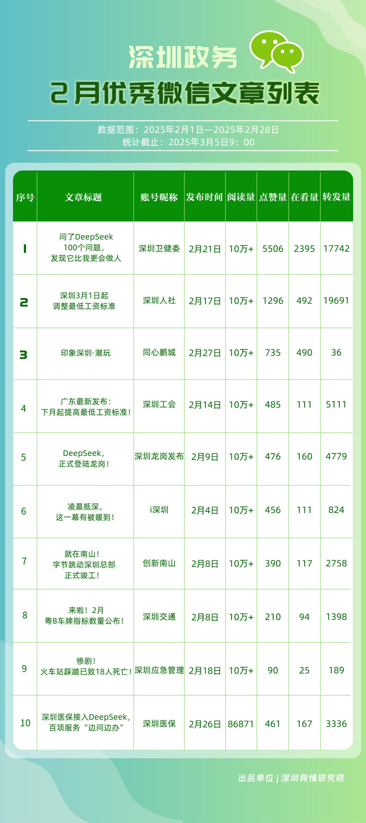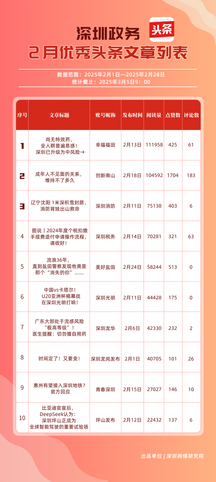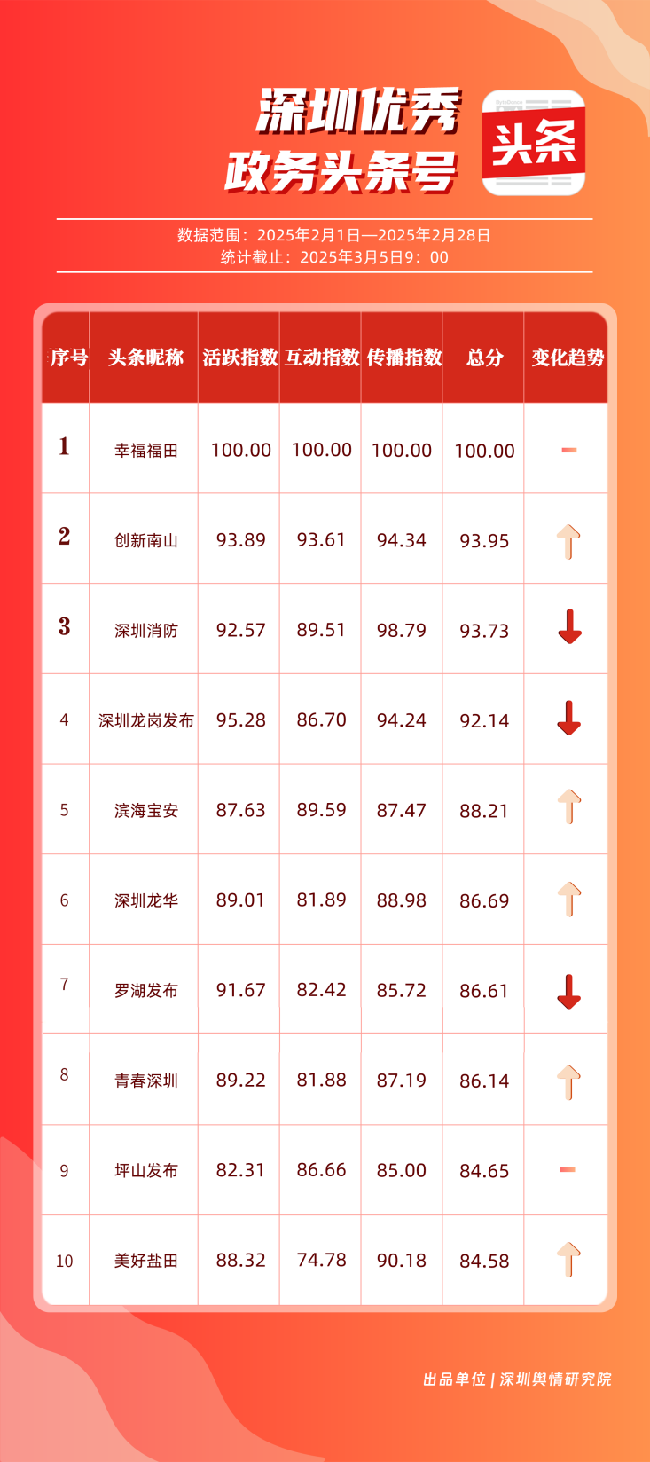 2月,“幸福福田”“創(chuàng)新南山”“深圳消防”“深圳龍崗發(fā)布”“濱海寶安”“深圳龍華”“羅湖發(fā)布”“青春深圳”“坪山發(fā)布”“美好鹽田”共10個(gè)政務(wù)頭條號(hào)入選“優(yōu)秀政務(wù)頭條號(hào)”榜單?!靶腋8L铩?月今日頭條作品總閱讀數(shù)超60萬,綜合實(shí)力較強(qiáng),多次位居頭條平臺(tái)榜單第一?!皠?chuàng)新南山”“深圳消防”“深圳龍崗發(fā)布”總分均在90分以上,展現(xiàn)出深圳政務(wù)頭條號(hào)的持續(xù)影響力,為其他政務(wù)賬號(hào)提供了可借鑒的運(yùn)營(yíng)范例。