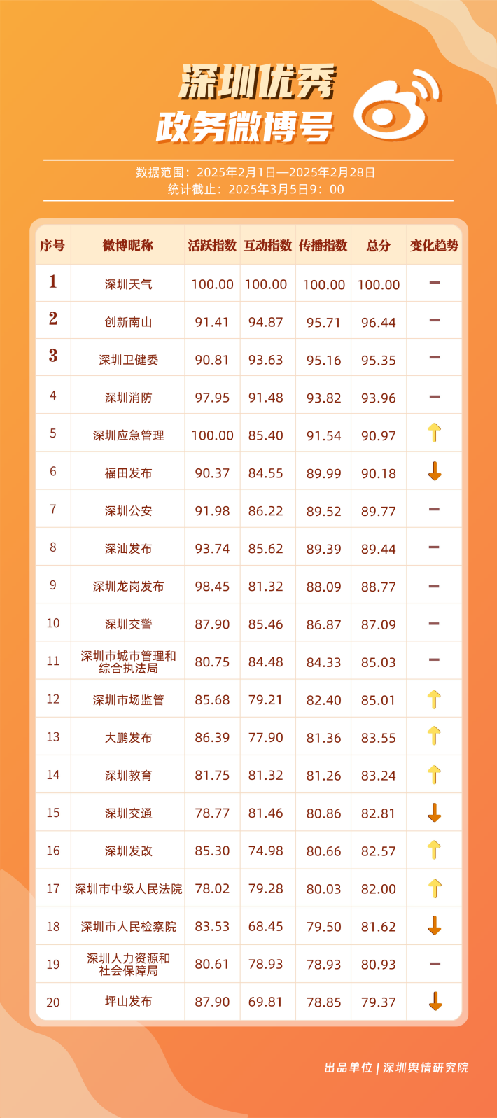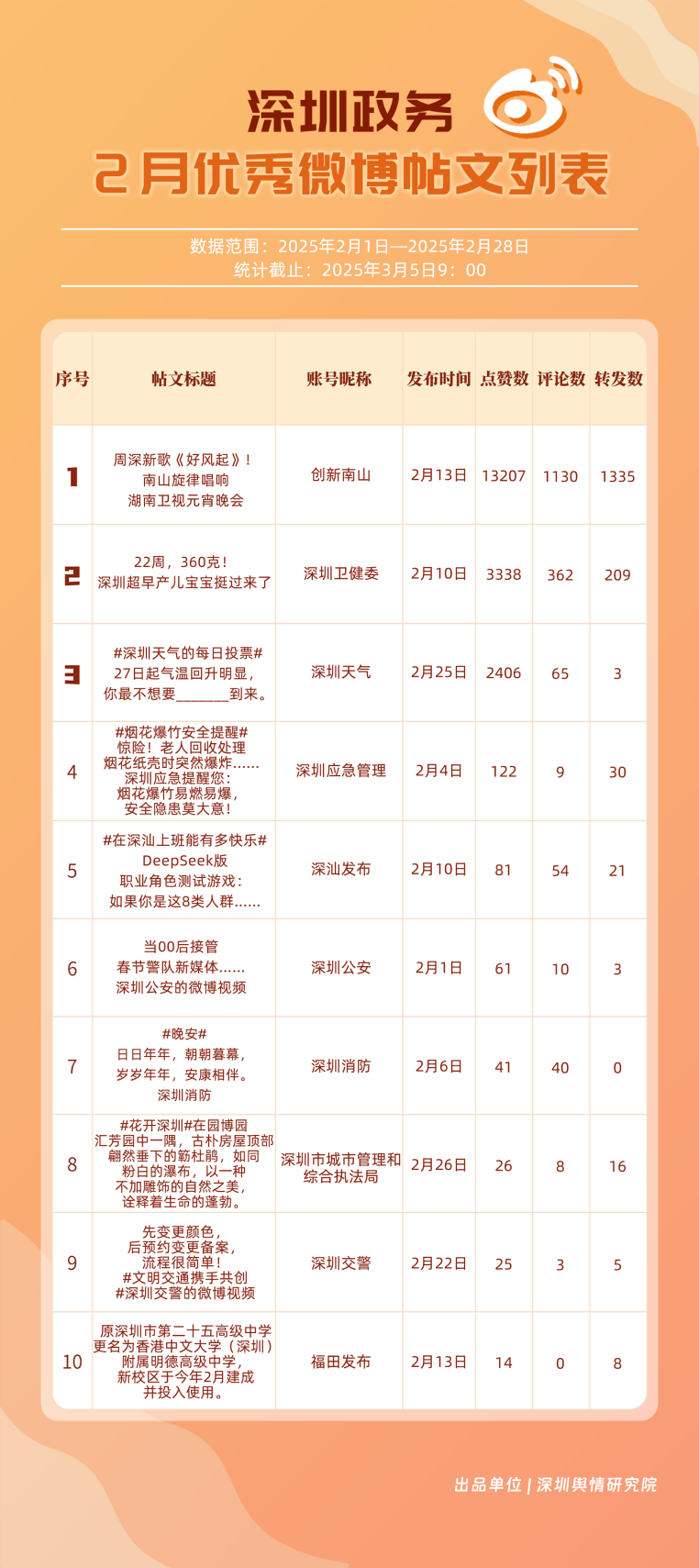 2月,“深圳天氣”“創(chuàng)新南山”“深圳衛(wèi)健委”“深圳消防”“深圳應(yīng)急管理”“福田發(fā)布”“深圳公安”“深汕發(fā)布”“深圳龍崗發(fā)布”“深圳交警”等20個(gè)賬號(hào)入選“優(yōu)秀政務(wù)微博號(hào)”。綜合看來,本月榜單前10名較上期變動(dòng)不大,反映出靠前賬號(hào)運(yùn)營(yíng)發(fā)揮較穩(wěn)定。其中,“深圳天氣”在榜單中獲得第一名,該賬號(hào)與網(wǎng)民互動(dòng)積極,2月作品總點(diǎn)贊數(shù)超8萬次;“創(chuàng)新南山”“深圳衛(wèi)健委”“深圳消防”“深圳應(yīng)急管理”也各有所長(zhǎng),排名靠前,展現(xiàn)出深圳政務(wù)微博在形象塑造、民生服務(wù)、應(yīng)急科普等領(lǐng)域的持續(xù)影響力。