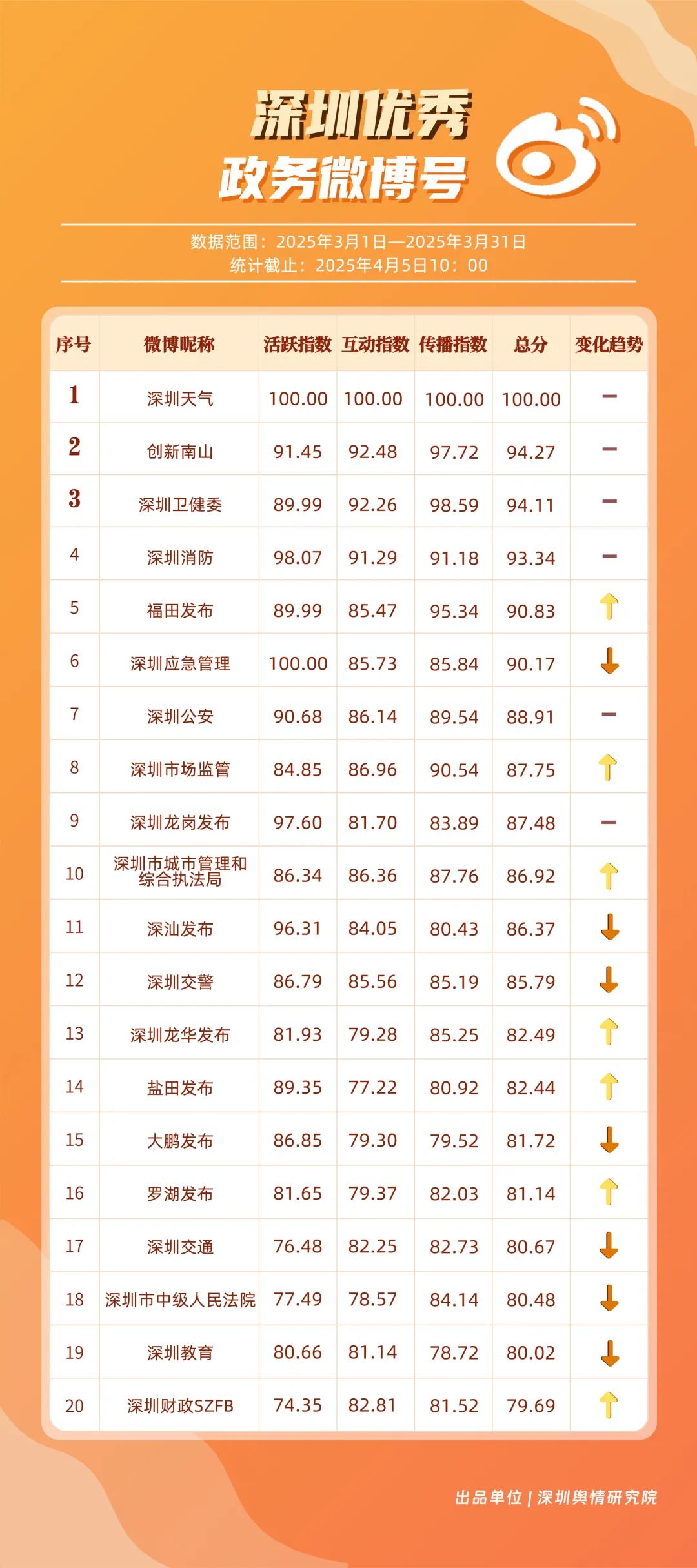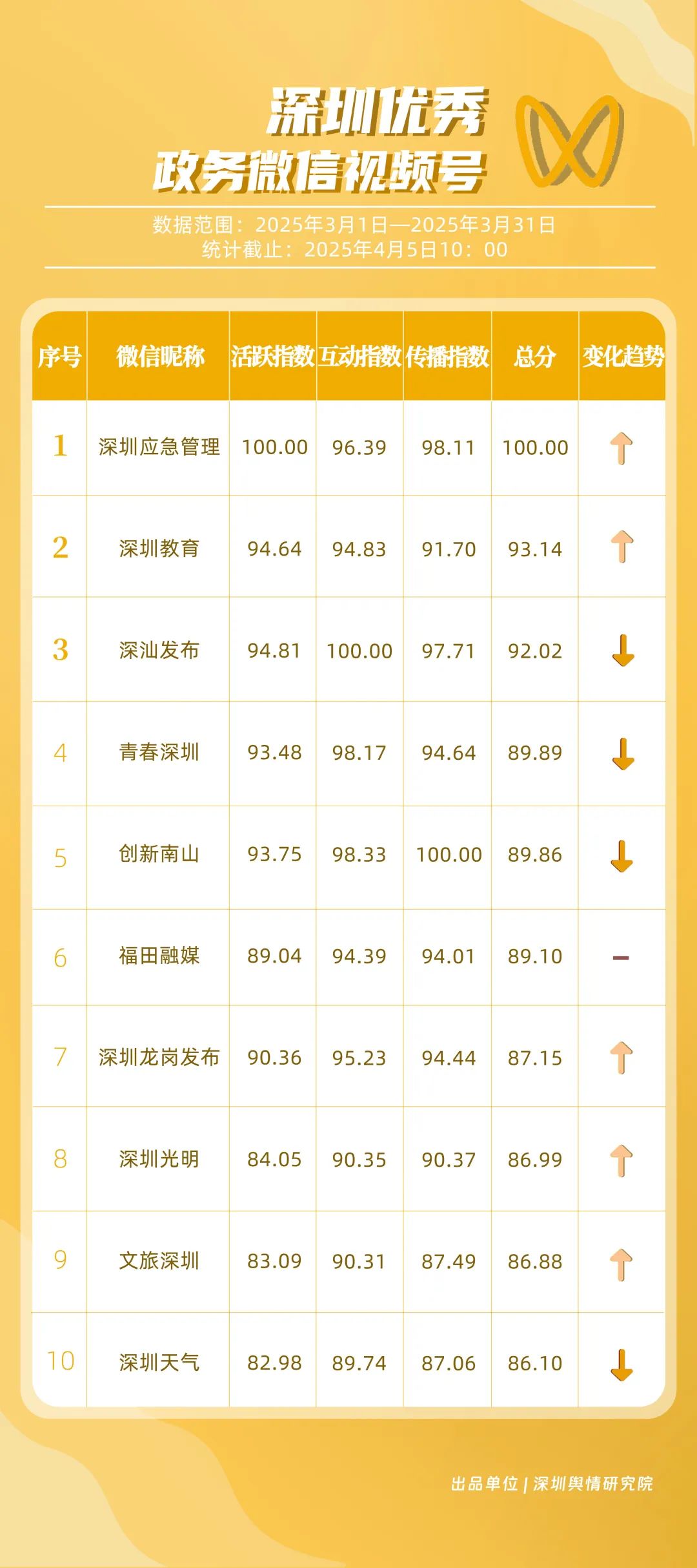 3月,市衛(wèi)生健康委、龍崗區(qū)、市氣象局、深汕特別合作區(qū)、南山區(qū)、福田區(qū)、市應(yīng)急管理局、龍華區(qū)、寶安區(qū)、光明區(qū)榮登“深圳優(yōu)秀政務(wù)新媒體矩陣”榜單。3月,市衛(wèi)生健康委新媒體矩陣持續(xù)關(guān)注市民身心健康,發(fā)布健康科普內(nèi)容,穩(wěn)居榜單第一位;龍崗區(qū)新媒體矩陣在抖音、微信視頻號平臺發(fā)力宣傳,躍居榜單第二位;市氣象局新媒體矩陣在微博平臺連續(xù)多期獲得滿分,持續(xù)以氣象預(yù)警與生活指南結(jié)合的內(nèi)容模式,為市民帶來便利信息。以上賬號在“深圳優(yōu)秀政務(wù)新媒體矩陣”榜單中榮獲前三名。此外,深汕特別合作區(qū)新媒體矩陣積極發(fā)布網(wǎng)絡(luò)熱點(diǎn)內(nèi)容,收獲較多網(wǎng)民關(guān)注分享;南山區(qū)新媒體矩陣多平臺實(shí)力強(qiáng)勁,以88.37分居于榜單第五位。值得關(guān)注的是,寶安區(qū)新媒體矩陣時隔多期躋身榜單前十名,多平臺均衡發(fā)展成效初顯。