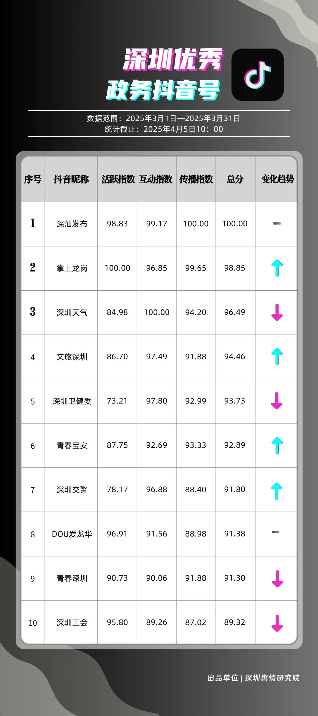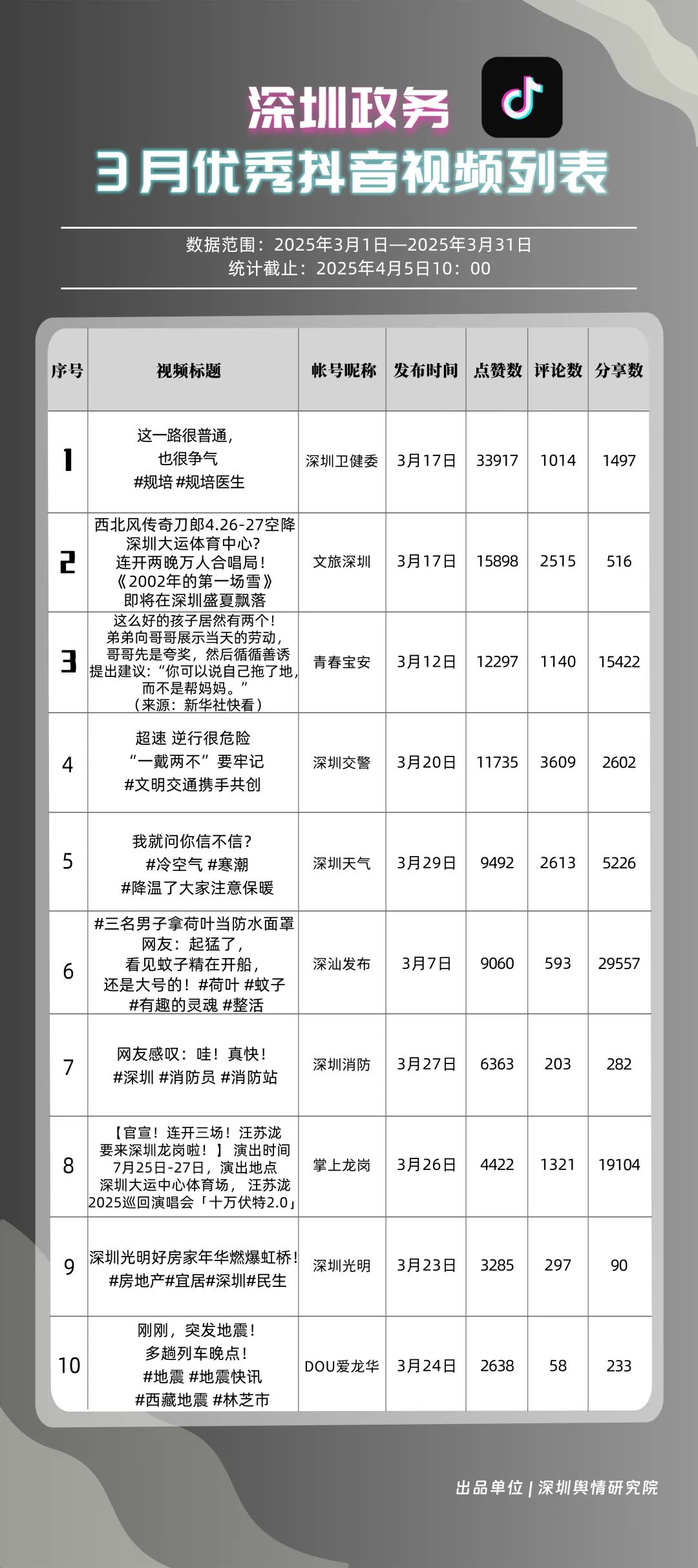 3月,“深汕發(fā)布”“掌上龍崗”“深圳天氣”“文旅深圳”“深圳衛(wèi)健委”“青春寶安”“深圳交警”“DOU愛龍華”“青春深圳”“深圳工會”共10個政務(wù)抖音號獲得“深圳優(yōu)秀政務(wù)抖音號”稱號。其中,“深汕發(fā)布”位于榜單第一名,3月共收獲5萬余次點(diǎn)贊、8萬余次轉(zhuǎn)發(fā),反映出賬號作品的較高吸引力;“深圳龍崗”以98.85分位于榜單第二名,與榜首分差微小,整體實(shí)力不俗。緊隨其后的分別是“深圳天氣”“文旅深圳”“深圳衛(wèi)健委”,三賬號產(chǎn)出內(nèi)容優(yōu)質(zhì),也獲得較高評分。相關(guān)上榜單位展現(xiàn)了深圳政務(wù)新媒體賬號在短視頻傳播領(lǐng)域的創(chuàng)新探索力與傳播實(shí)效性。