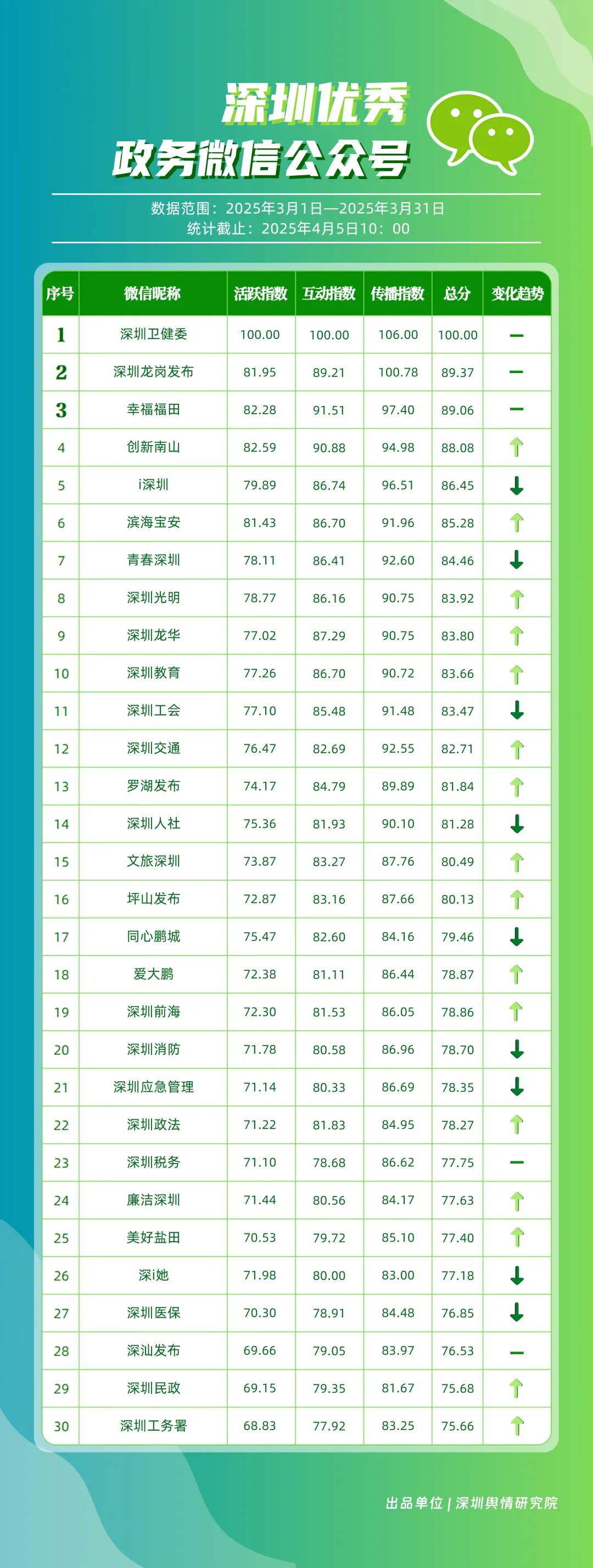 3月,包括“深圳衛(wèi)健委”“深圳龍崗發(fā)布”“幸福福田”“創(chuàng)新南山”“i深圳”“濱海寶安”“青春深圳”“深圳光明”“深圳龍華”“深圳教育”等在內(nèi)的30個賬號入選“深圳優(yōu)秀政務(wù)微信公眾號”。其中,“深圳衛(wèi)健委”超70篇文章閱讀量達(dá)10萬次以上,穩(wěn)居榜單首位;“深圳龍崗發(fā)布”也取得較好傳播效果,在3月產(chǎn)出10余篇閱讀量超10萬次的熱門文章,位于榜單第二位;“幸福福田”也積極發(fā)布高質(zhì)量內(nèi)容,穩(wěn)住榜單第三位置;緊隨其后的是“創(chuàng)新南山”“i深圳”“濱海寶安”,總分均在85分以上。這充分展現(xiàn)了深圳新媒體傳播生態(tài)體系中,各主體的傳播優(yōu)勢與影響力版圖正逐漸凸顯。