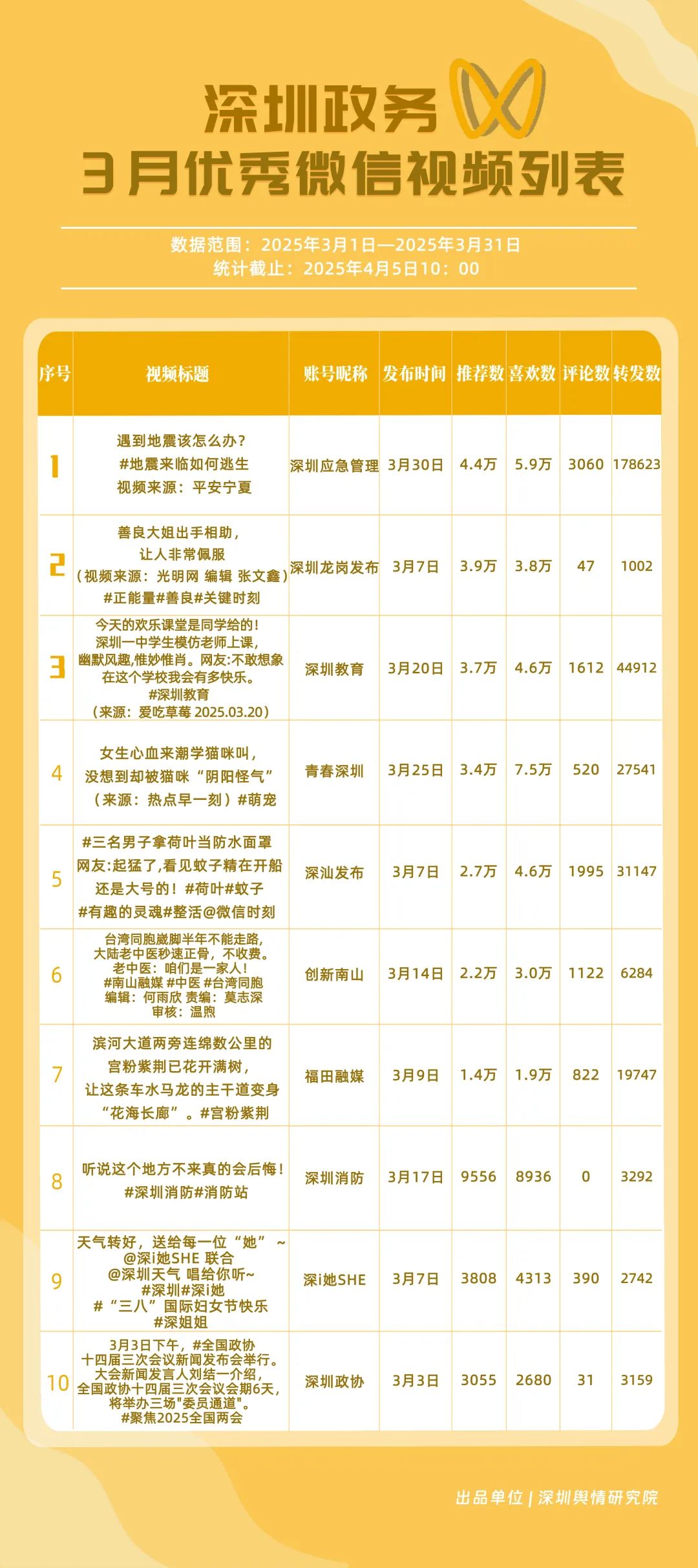 3月,獲“深圳優(yōu)秀政務(wù)微信視頻號”稱號的分別是“深圳應(yīng)急管理”“深圳教育”“深汕發(fā)布”“青春深圳”“創(chuàng)新南山”“福田融媒”“深圳龍崗發(fā)布”“深圳光明”“文旅深圳”“深圳天氣”。其中,“深圳應(yīng)急管理”以20余篇作品收獲超20萬次轉(zhuǎn)發(fā),躍居第一名,一期有關(guān)“地震來臨如何逃生”的視頻收獲超17萬次轉(zhuǎn)發(fā),展現(xiàn)了其內(nèi)容的高實(shí)用性?!吧钲诮逃薄吧钌前l(fā)布”位于榜單第二、三位,總分超90分,反映出兩賬號在民生教育、區(qū)域宣傳領(lǐng)域擁有較好傳播效果?!扒啻荷钲凇薄皠?chuàng)新南山”“福田融媒”等賬號也在3月發(fā)布優(yōu)質(zhì)視頻內(nèi)容,展現(xiàn)了深圳政務(wù)新媒體在視頻號平臺宣傳的創(chuàng)新探索。