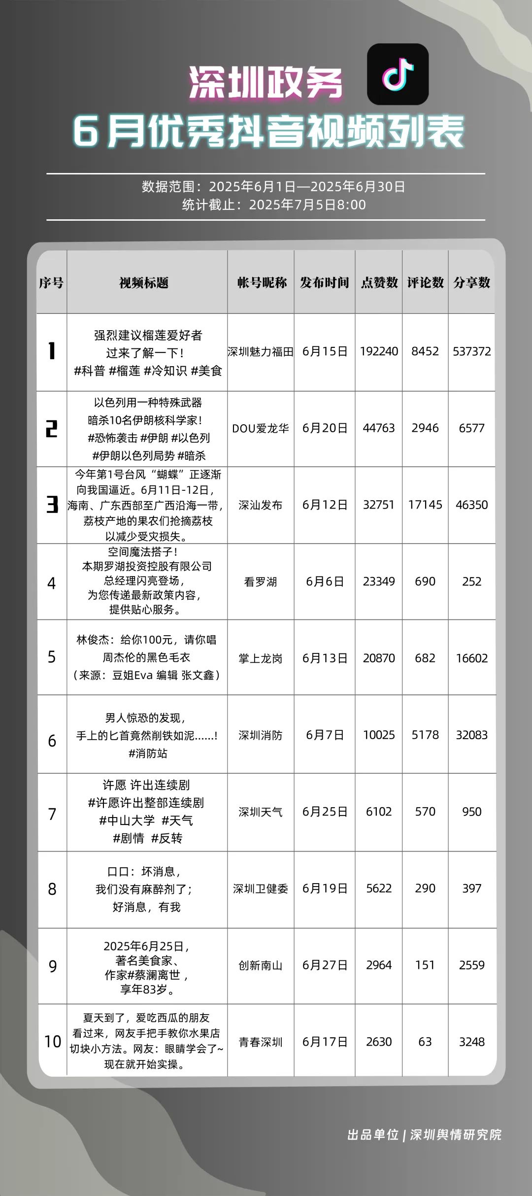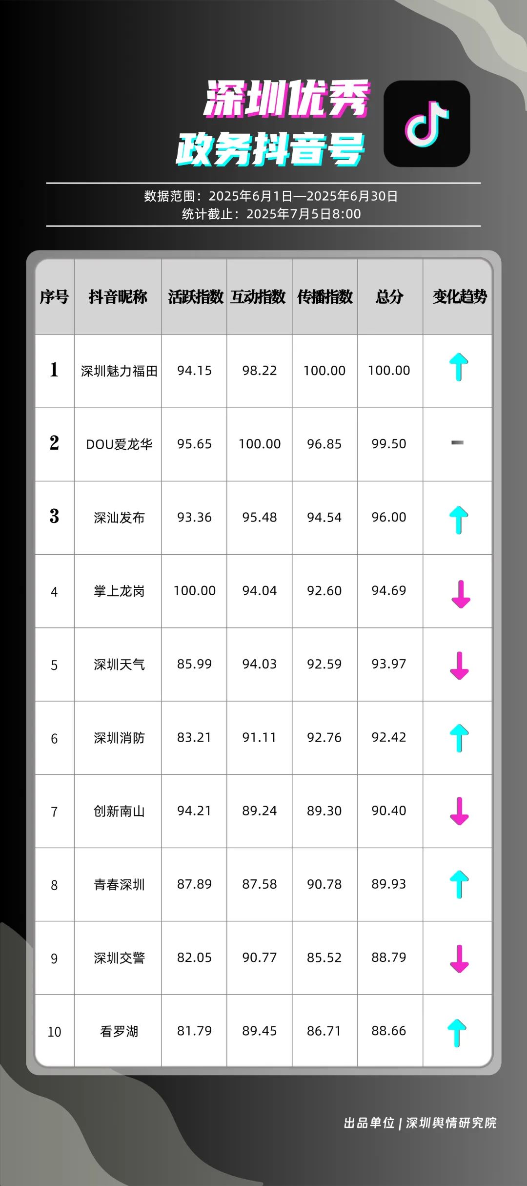 6月,“深圳魅力福田”“DOU愛(ài)龍華”“深汕發(fā)布”“掌上龍崗”“深圳天氣”“深圳消防”“創(chuàng)新南山”“青春深圳”“深圳交警”“看羅湖”共10個(gè)政務(wù)抖音號(hào)獲得“優(yōu)秀政務(wù)抖音號(hào)”稱號(hào)。6月,“深圳魅力福田”登頂,憑借其城市人文、社會(huì)熱點(diǎn)類主題短視頻,在傳播指數(shù)得分創(chuàng)新高;“DOU愛(ài)龍華”“深汕發(fā)布”“掌上龍崗”緊隨其后,通過(guò)各類熱點(diǎn)、創(chuàng)意內(nèi)容提升傳播效能?!吧钲谔鞖狻薄吧钲谙馈币脖憩F(xiàn)突出,短視頻內(nèi)容兼具“信息傳遞”與“情感共鳴”,用戶參與度持續(xù)提升,不斷為網(wǎng)民傳播有價(jià)值的政務(wù)信息資訊。