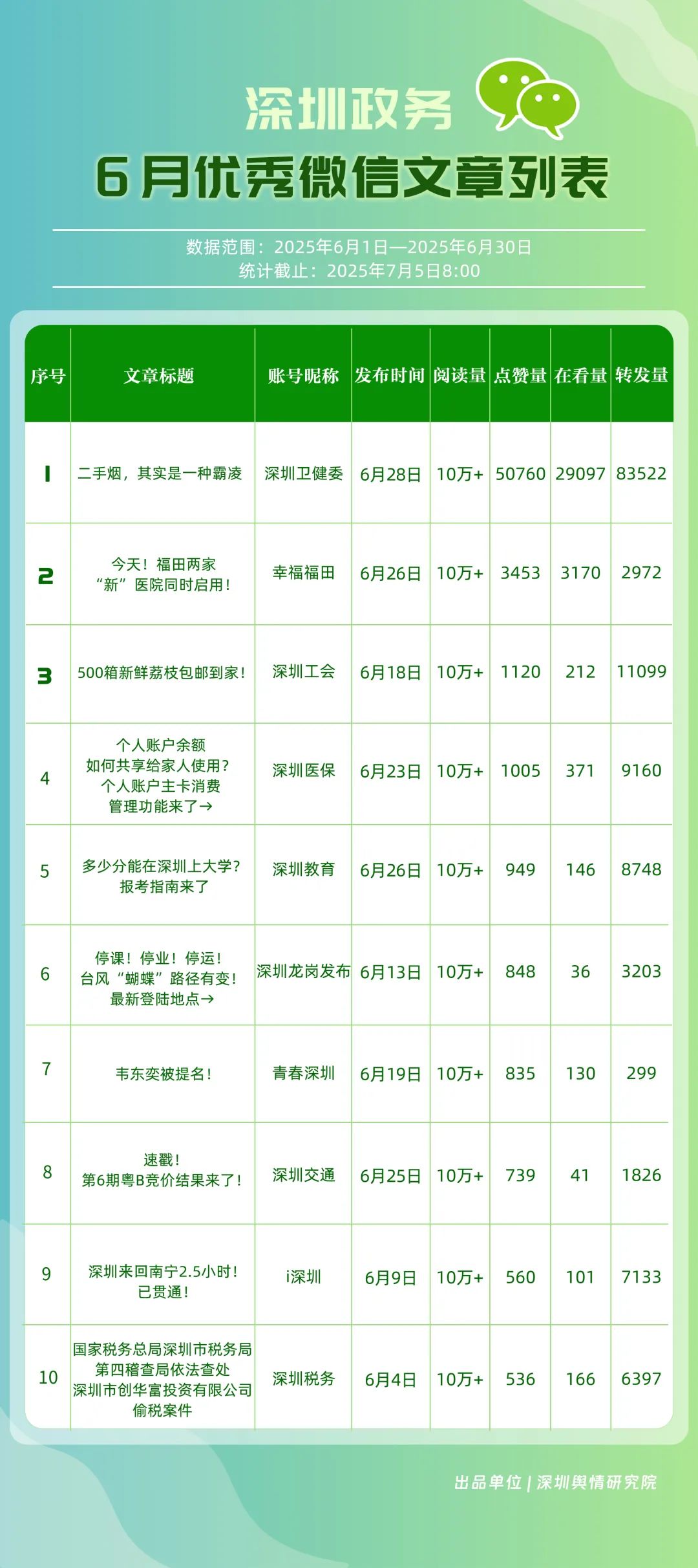 6月,30個(gè)政務(wù)微信公眾號(hào)入選“深圳優(yōu)秀政務(wù)微信公眾號(hào)”榜單,其中包括“深圳衛(wèi)健委”“幸福福田”“深圳龍崗發(fā)布”“i深圳”“創(chuàng)新南山”“青春深圳”“深圳光明”“深圳教育”“深圳龍華”“深圳工會(huì)”等。6月,榜單前三名的賬號(hào)保持穩(wěn)定,且各創(chuàng)作出多篇閱讀量超10萬(wàn)次的優(yōu)質(zhì)文章,傳播指數(shù)得分均在100分以上?!吧钲谛l(wèi)健委”持續(xù)位居榜首,內(nèi)容專業(yè)性與傳播力持續(xù)領(lǐng)跑;“幸福福田”以92.94分位居第二,得分較5月有所提高?!吧钲邶垗彴l(fā)布”“i深圳”“創(chuàng)新南山”也積極發(fā)布民生服務(wù)與宣傳活動(dòng)內(nèi)容,排名靠前。上榜賬號(hào)整體呈現(xiàn)“內(nèi)容精品化、服務(wù)場(chǎng)景化”特點(diǎn),持續(xù)優(yōu)化信息供給質(zhì)量,為用戶打造有深度的政務(wù)信息服務(wù)矩陣。