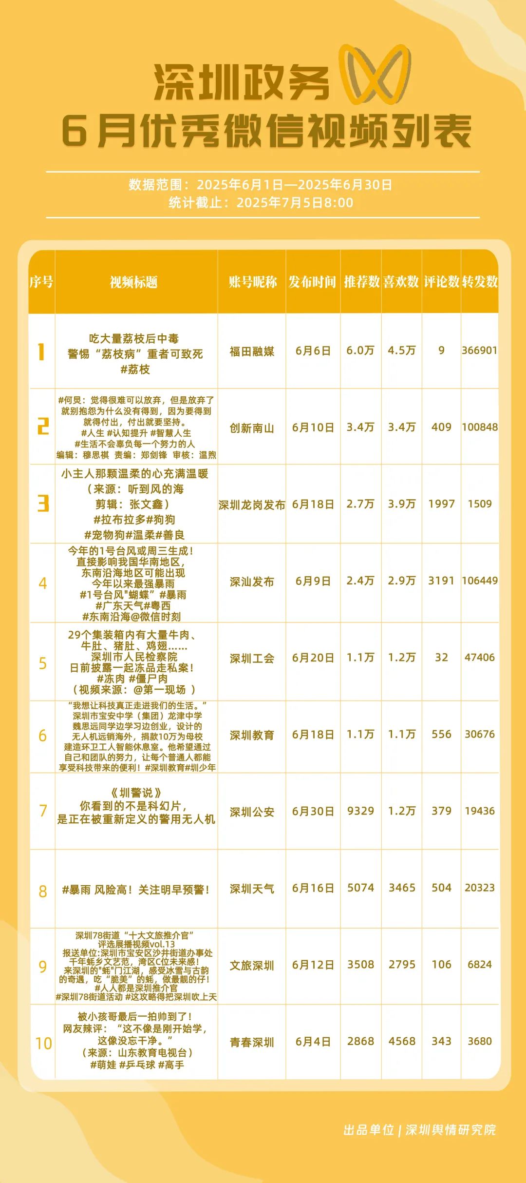 6月,獲得“深圳優(yōu)秀政務(wù)微信視頻號(hào)”稱號(hào)的是“福田融媒”“深汕發(fā)布”“深圳龍崗發(fā)布”“創(chuàng)新南山”“深圳教育”“深圳天氣”“青春深圳”“深圳公安”“文旅深圳”“深圳應(yīng)急管理”。其中,“福田融媒”以活躍、傳播指數(shù)雙滿分居榜首,其視頻《吃大量荔枝后中毒 警惕“荔枝病”重者可致死》獲得超36萬(wàn)次轉(zhuǎn)發(fā),成為爆款案例;“深汕發(fā)布”“深圳龍崗發(fā)布”“創(chuàng)新南山”得分在90分以上,在互動(dòng)、傳播方面表現(xiàn)亮眼。這些優(yōu)秀的政務(wù)微信視頻號(hào)以各自的獨(dú)特風(fēng)格持續(xù)發(fā)力,為政務(wù)及民生信息傳遞開(kāi)拓更鮮活、暢通的路徑。
