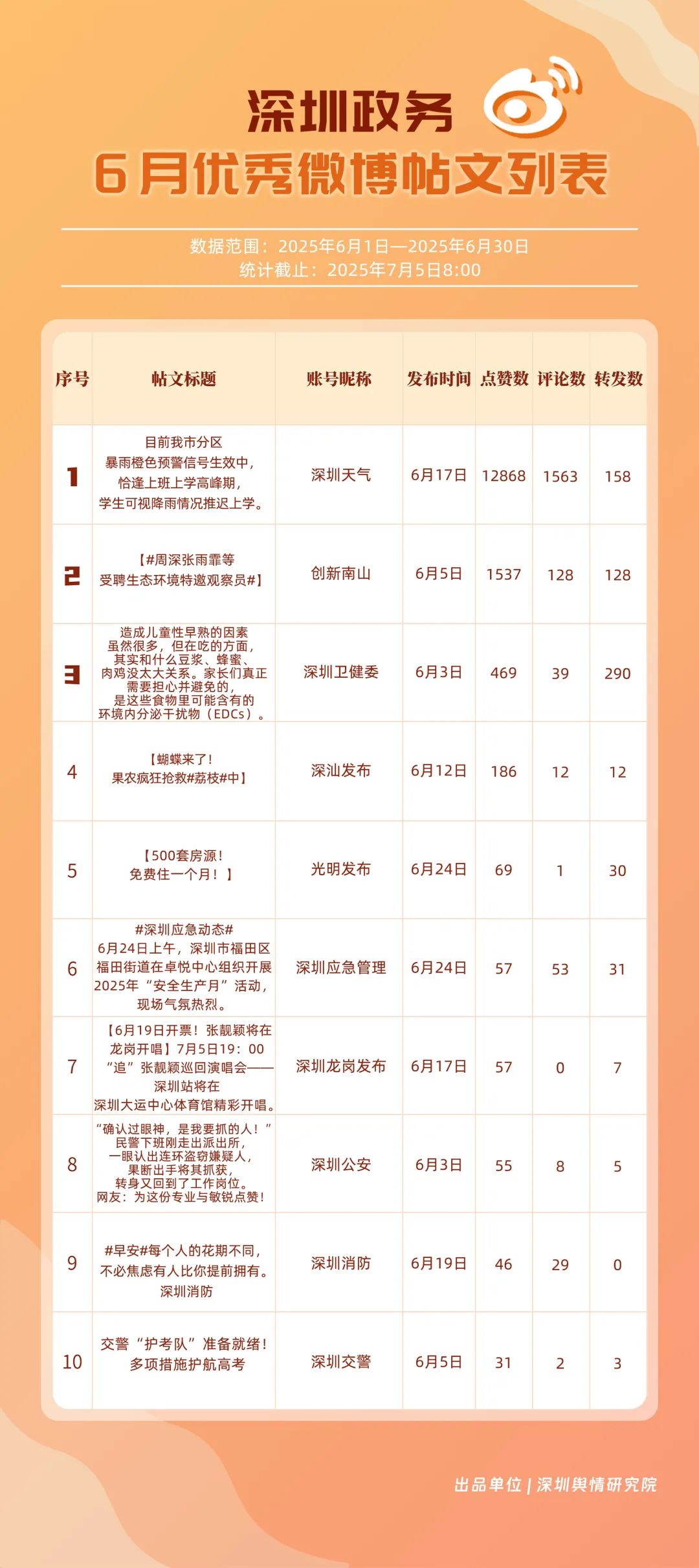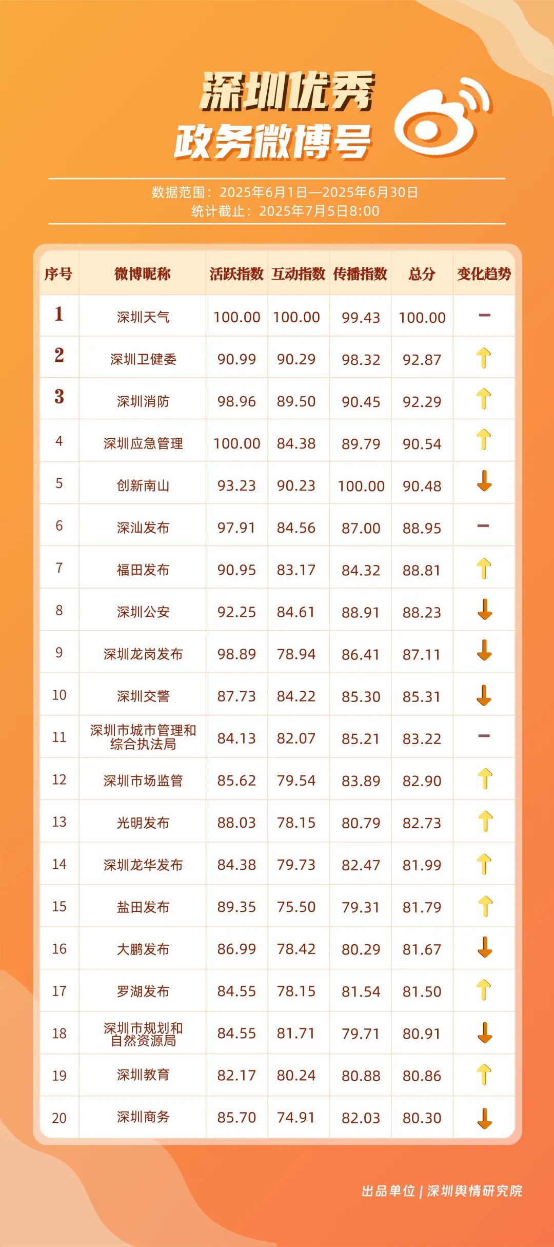 6月,“深圳天氣”“深圳衛(wèi)健委”“深圳消防”“深圳應(yīng)急管理”“創(chuàng)新南山”“深汕發(fā)布”“福田發(fā)布”“深圳公安”“深圳龍崗發(fā)布”“深圳交警”等20個(gè)賬號(hào)入選“優(yōu)秀政務(wù)微博號(hào)”。其中,“深圳天氣”以活躍、互動(dòng)指數(shù)雙滿分穩(wěn)居第一,氣象服務(wù)信息及時(shí)性與科普內(nèi)容趣味性獲市民高度認(rèn)可;“深圳衛(wèi)健委”“深圳消防”“深圳應(yīng)急管理”分別位列2至4位,通過(guò)熱點(diǎn)話題聯(lián)動(dòng)醫(yī)療、消防、應(yīng)急知識(shí)科普擴(kuò)大影響力,政務(wù)微博矩陣在突發(fā)事件響應(yīng)與民生服務(wù)中作用凸顯。