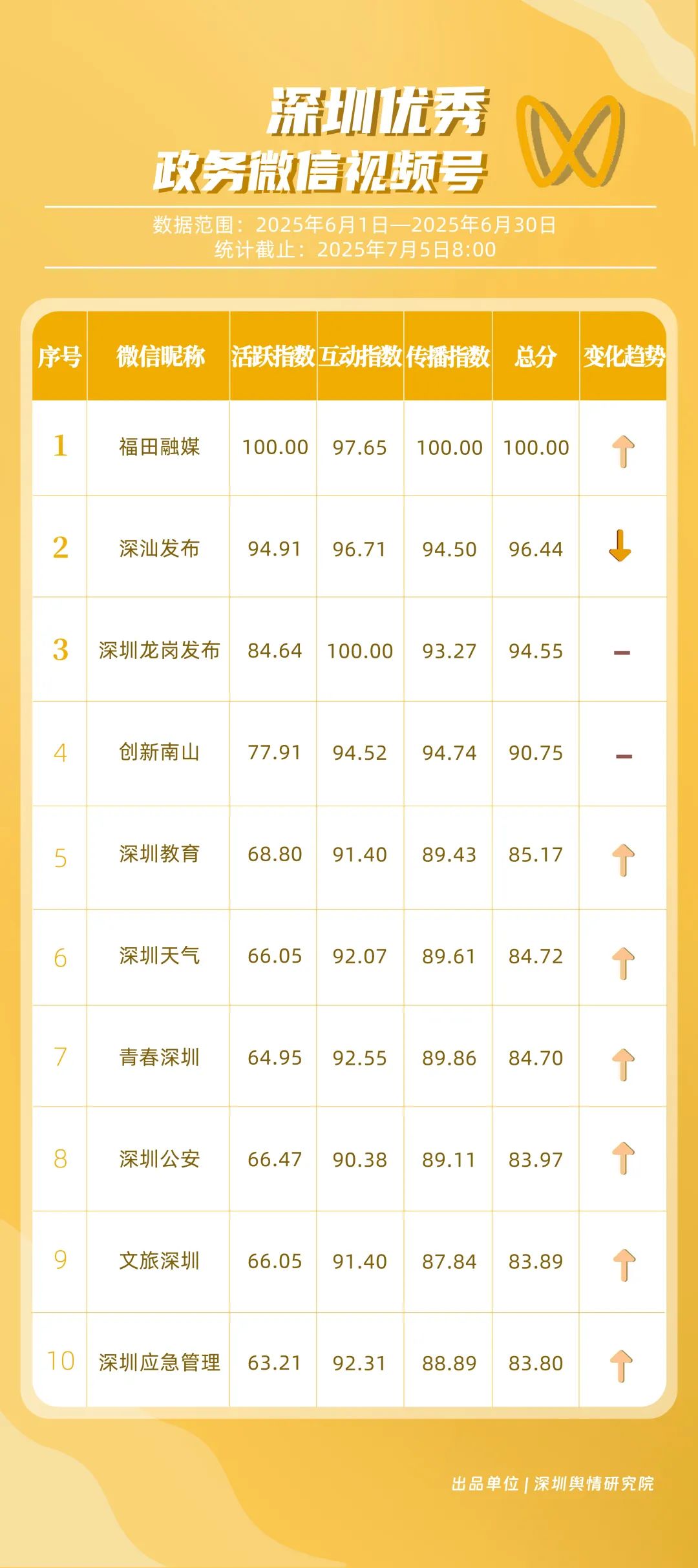 6月,“深圳幸福福田”“深圳消防”“創(chuàng)新南山”“羅湖發(fā)布”“深圳龍崗發(fā)布”“坪山發(fā)布”“深圳應(yīng)急管理”“深圳龍華”“深圳衛(wèi)健委”“青春深圳”共10個(gè)政務(wù)頭條號(hào)入選“優(yōu)秀政務(wù)頭條號(hào)”榜單?!吧钲谛腋8L铩薄吧钲谙馈薄皠?chuàng)新南山”連續(xù)位居榜單前3名,內(nèi)容具備較強(qiáng)的吸引力?!傲_湖發(fā)布”“深圳龍崗發(fā)布”排名也在榜單前列,排名較5月有所上升,在區(qū)域形象宣傳與民生服務(wù)中持續(xù)發(fā)力。