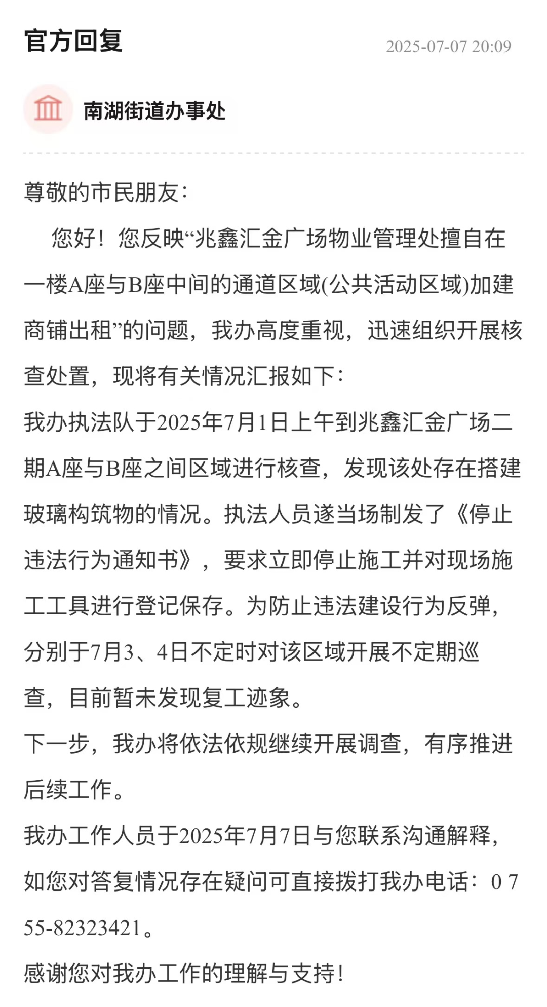 從市民反饋到執(zhí)法處置,羅湖區(qū)南湖街道辦事處以快速響應、精準執(zhí)法展現(xiàn)治理效能。通過現(xiàn)場核查、制發(fā)《停止違法行為通知書》、登記保存施工工具等措施,及時遏制違法搭建勢頭,并建立不定期巡查機制防止反彈。從“即時制止”到“長效監(jiān)督”的閉環(huán)管理,維護了業(yè)主合法權(quán)益與消防通道安全,為城市違建治理提供了高效務實的實踐樣本,彰顯基層執(zhí)法部門守護民生安全的責任擔當。