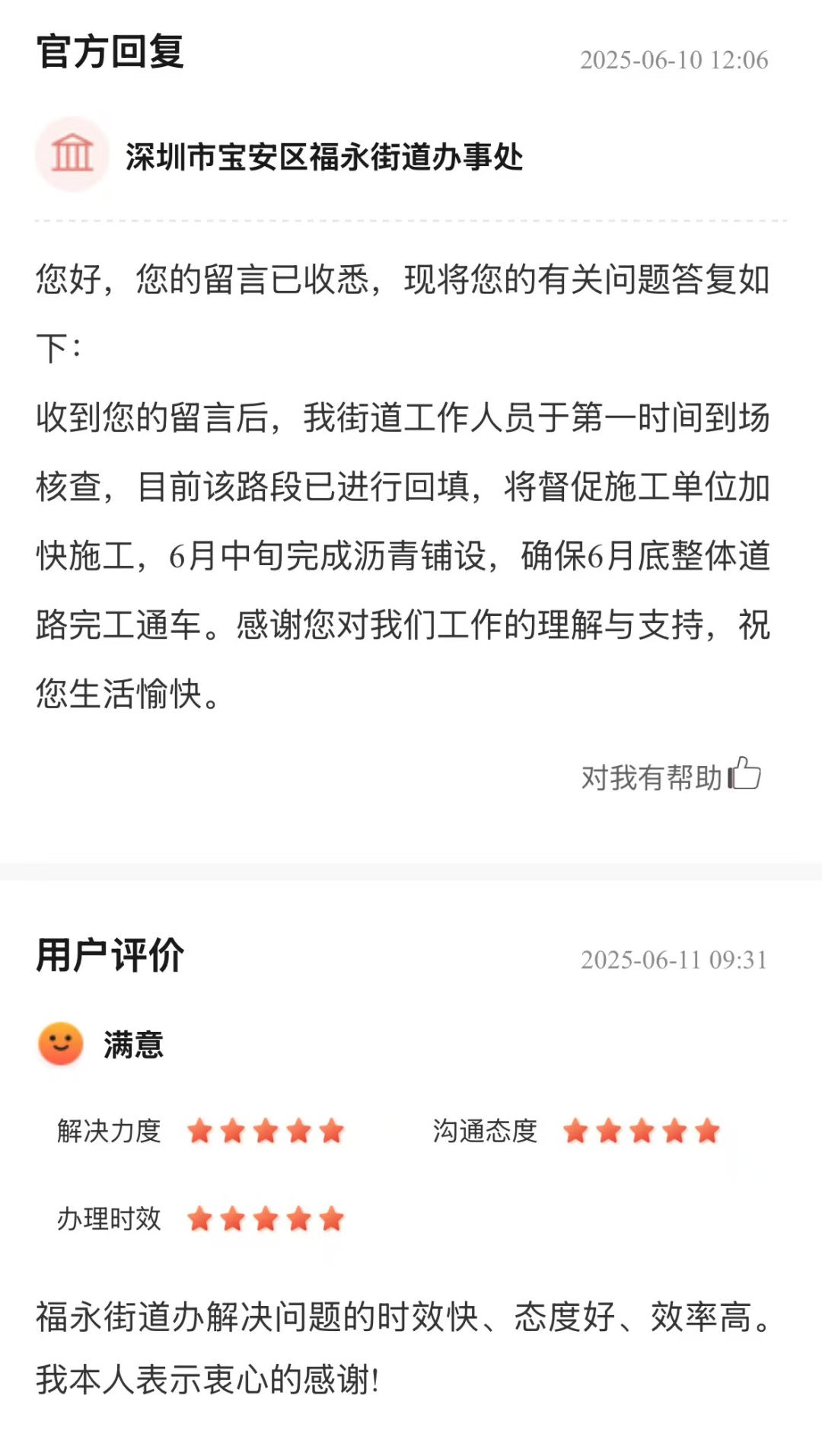 案例點評:道路銜接處的大坑大坎影響通行安全與道路順暢,亟待解決。街道辦收到留言后迅速行動,第一時間到場核查,明確將督促施工單位加快進度,在預計時間內(nèi)完成瀝青鋪設(shè)及道路整體完工,這些舉措體現(xiàn)了對道路通行問題的重視和高效的處理能力,為保障道路正常通行提供了有力保障,獲得了市民的滿意評價。