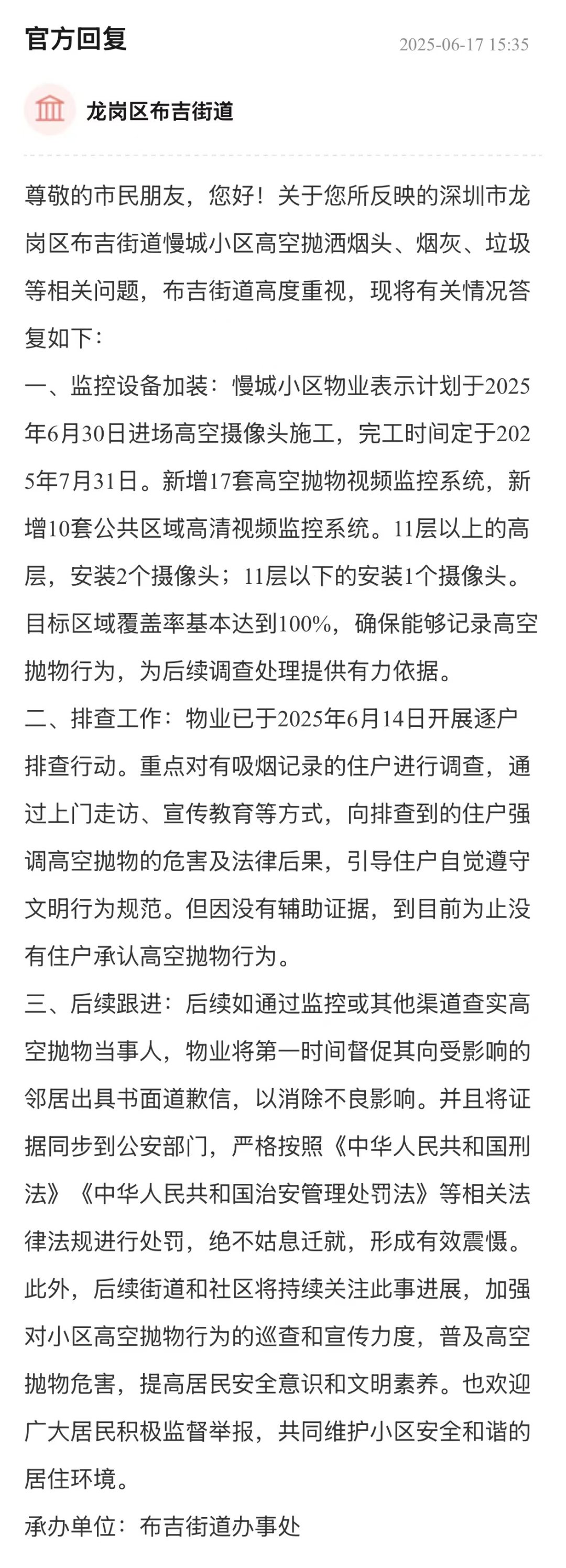高空拋物嚴重威脅居民人身與財產(chǎn)安全,需嚴肅對待。街道辦接到相關(guān)反映后,積極推動物業(yè)規(guī)劃加裝視頻監(jiān)控系統(tǒng),明確了施工和完工時間,同時安排物業(yè)開展逐戶排查,重點調(diào)查有吸煙記錄住戶,體現(xiàn)出對問題的重視和解決問題的行動力。在后續(xù)保障方面,明確查實拋物當事人后將督促其道歉并交由公安部門依規(guī)處罰,街道和社區(qū)也將持續(xù)關(guān)注、加強巡查與宣傳,為維護小區(qū)安全提供了有力支持。