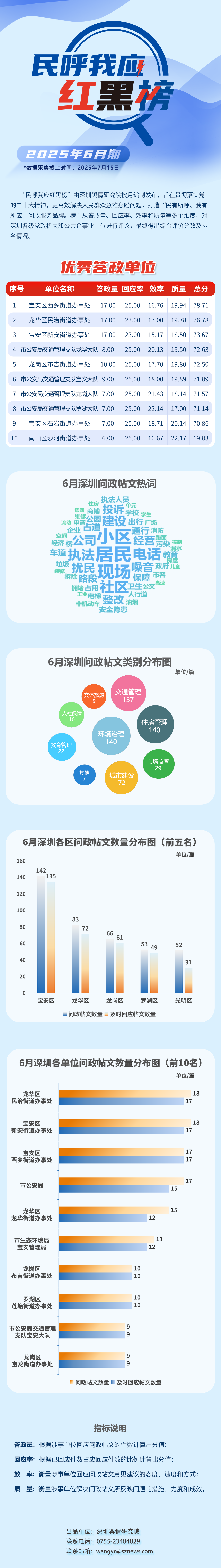 本期榜單采集的帖文主要來自深圳市及各區(qū)政府官網(wǎng)、深圳論壇、人民網(wǎng)領(lǐng)導留言板、深圳新聞網(wǎng)“民呼我應”等平臺,所采集帖文發(fā)布時間為2025年6月1日至6月30日,采集截止時間為2025年7月15日。