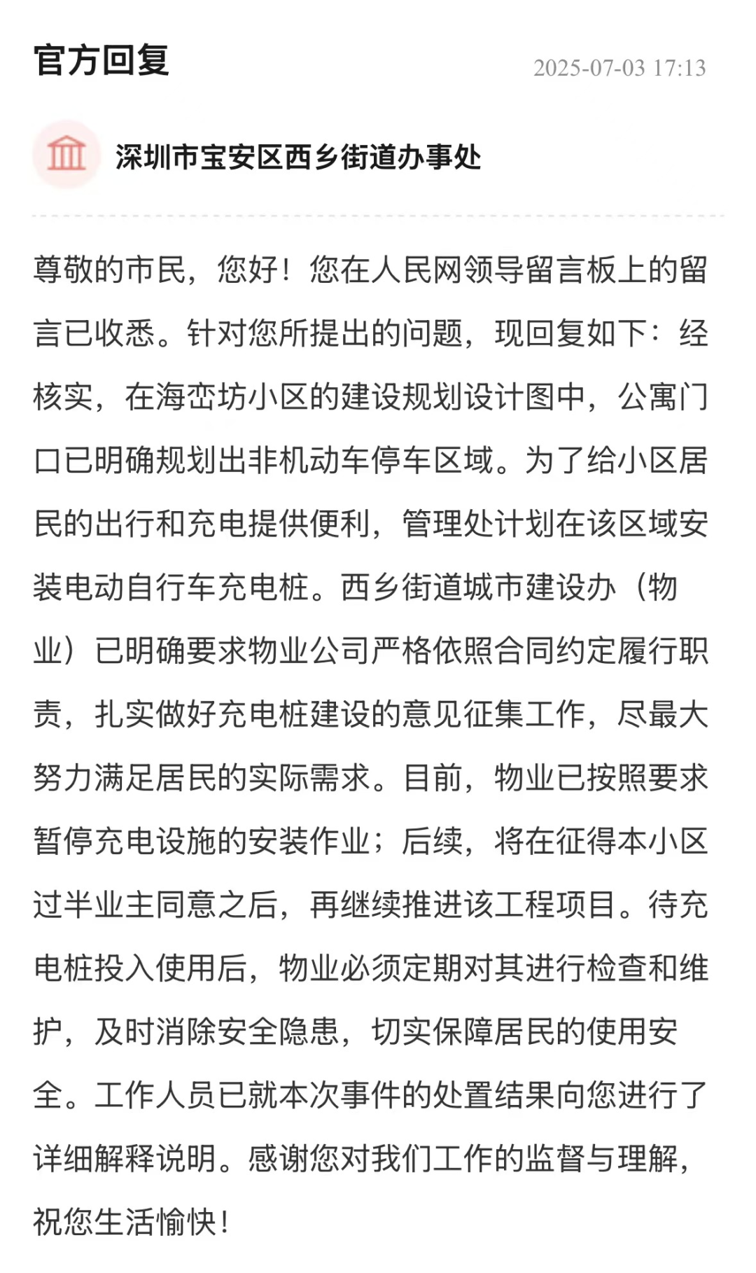 有市民反映寶安區(qū)西鄉(xiāng)街道一小區(qū)物業(yè)強行建設(shè)充電樁
