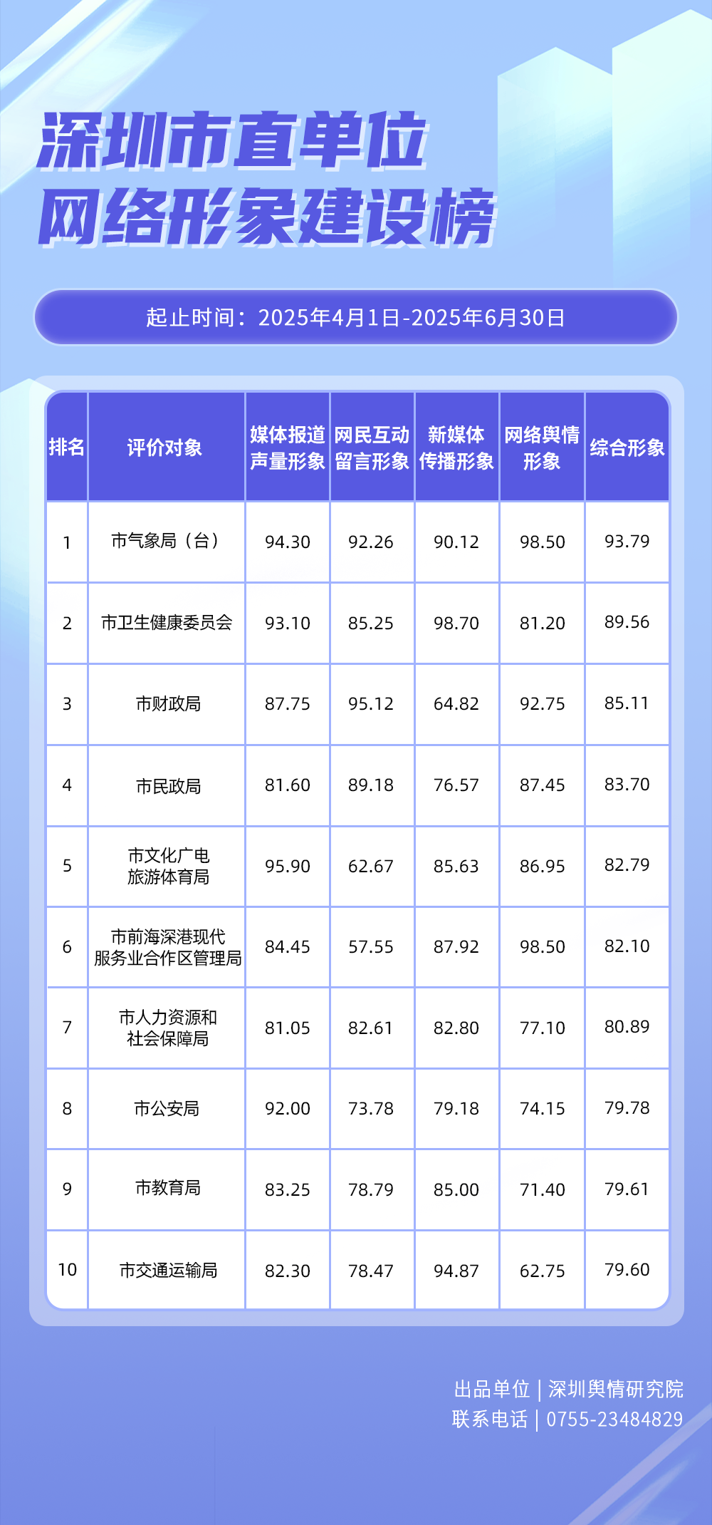 4-6月,市氣象局、市衛(wèi)生健康委員會、市財政局、市民政局、市文化廣電旅游體育局、市前海深港現(xiàn)代服務業(yè)合作區(qū)管理局、市人力資源和社會保障局、市公安局、市教育局、市交通運輸局在網(wǎng)絡形象建設工作方面表現(xiàn)相對突出,登上《深圳市直單位網(wǎng)絡形象建設榜》。其中,市氣象局、市衛(wèi)生健康委員會的網(wǎng)絡形象建設工作持續(xù)走在前列,其他上榜單位各展所長,在網(wǎng)絡宣傳、互動回應等方面積極作為,共同塑造深圳市直單位良好網(wǎng)絡形象。