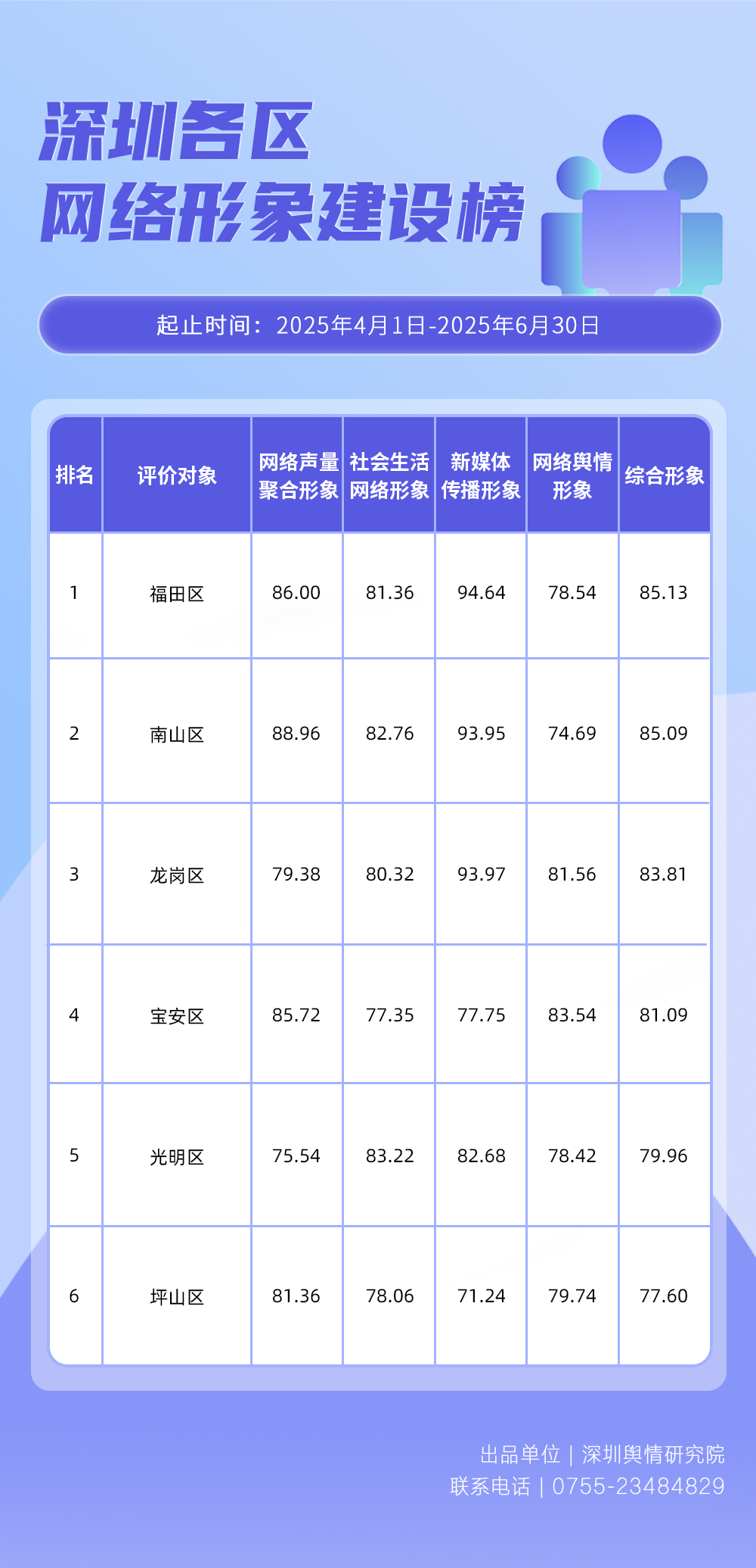 4-6月,福田區(qū)、南山區(qū)、龍崗區(qū)、寶安區(qū)、光明區(qū)、坪山區(qū)登上榜單前六。其中,福田區(qū)、南山區(qū)、龍崗區(qū)位居榜單前三名,在新媒體傳播形象、社會生活網(wǎng)絡形象等多個指標上表現(xiàn)出色,綜合評價分值在85分左右。寶安區(qū)、光明區(qū)、坪山區(qū)緊隨其后,在各項網(wǎng)絡形象建設工作中持續(xù)發(fā)力,彰顯出了各區(qū)網(wǎng)絡形象建設的協(xié)同共進之態(tài)。