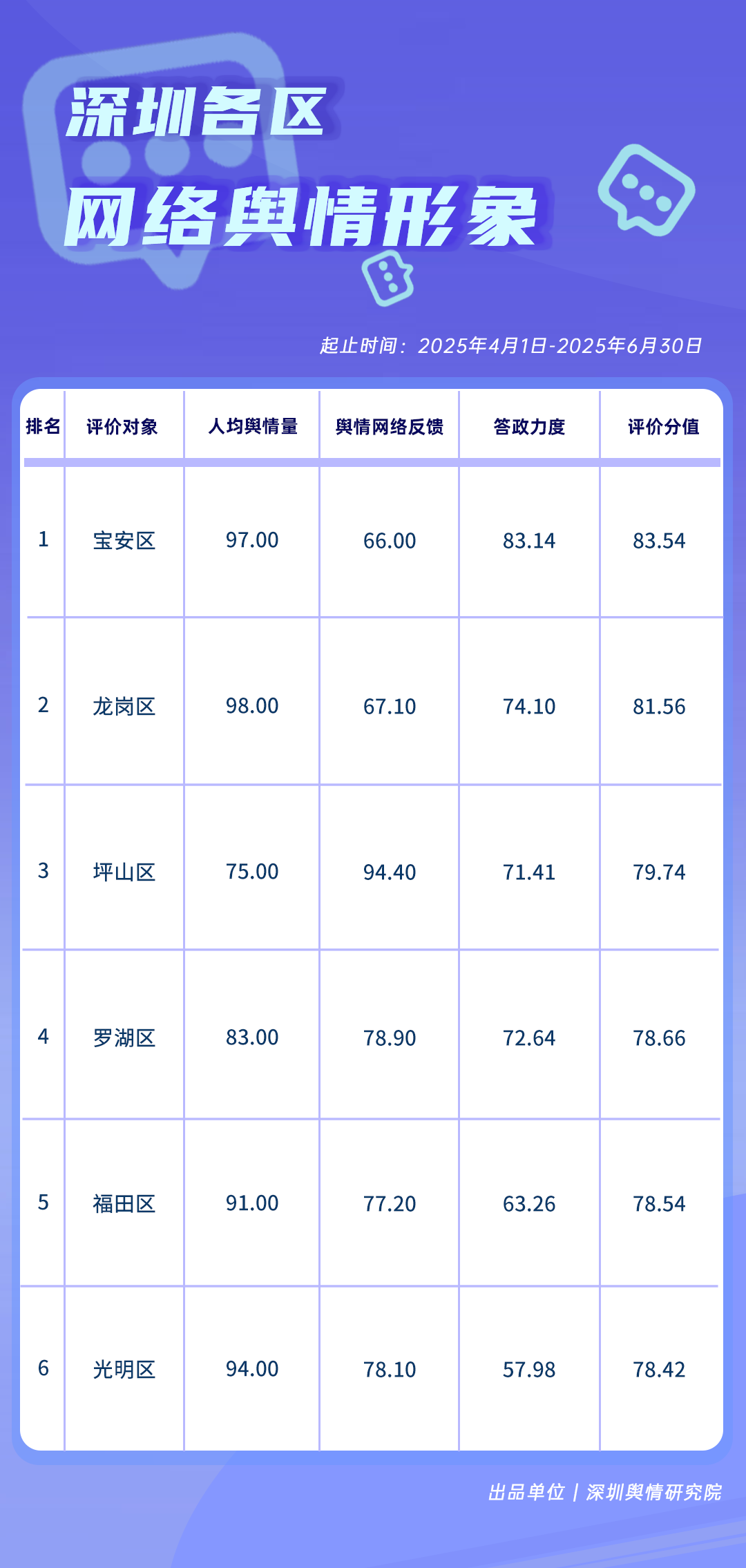 4-6月,在網(wǎng)絡輿情方面,寶安區(qū)、龍崗區(qū)憑借較低的人均輿情量、較好的答政效果,位居榜單前二;坪山區(qū)、羅湖區(qū)、福田區(qū)、光明區(qū)也躋身前列,以優(yōu)異分數(shù)展現(xiàn)其在網(wǎng)絡輿情工作中的積極成效,彰顯了各區(qū)在營造良好網(wǎng)絡輿情環(huán)境、及時回應網(wǎng)民訴求上的主動擔當。
