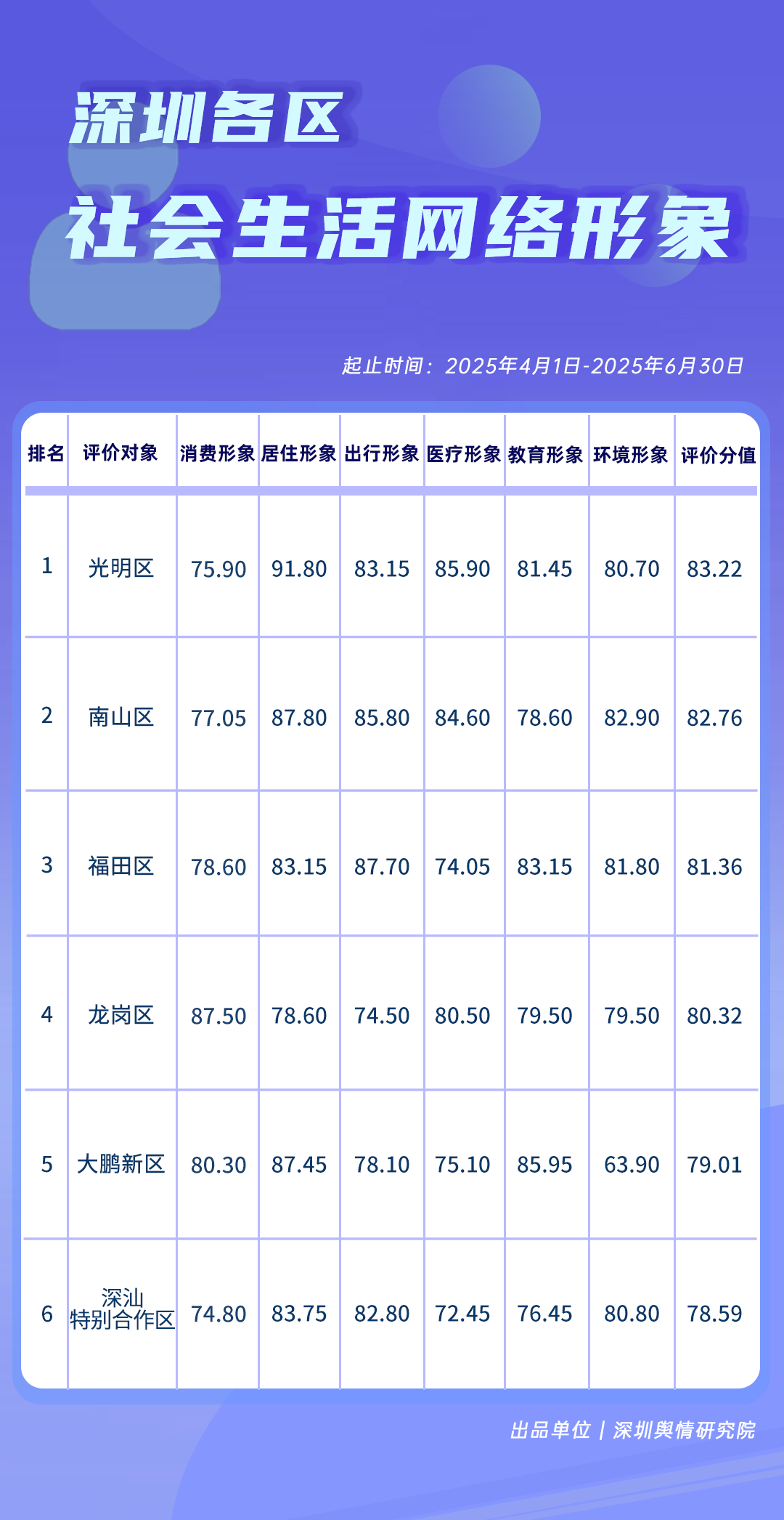 4-6月,《深圳各區(qū)社會生活網(wǎng)絡形象榜》中,光明區(qū)憑借在居住、醫(yī)療、出行等多方面的良好網(wǎng)絡呈現(xiàn),獲得較高綜合評價分值,南山區(qū)、福田區(qū)、龍崗區(qū)也表現(xiàn)優(yōu)異,四區(qū)綜合評價分值均超80分。大鵬新區(qū)、深汕特別合作區(qū)也在榜單中占據(jù)靠前位置,成為各區(qū)借助網(wǎng)絡力量增進民生福祉、推動協(xié)調(diào)發(fā)展的生動展現(xiàn)。