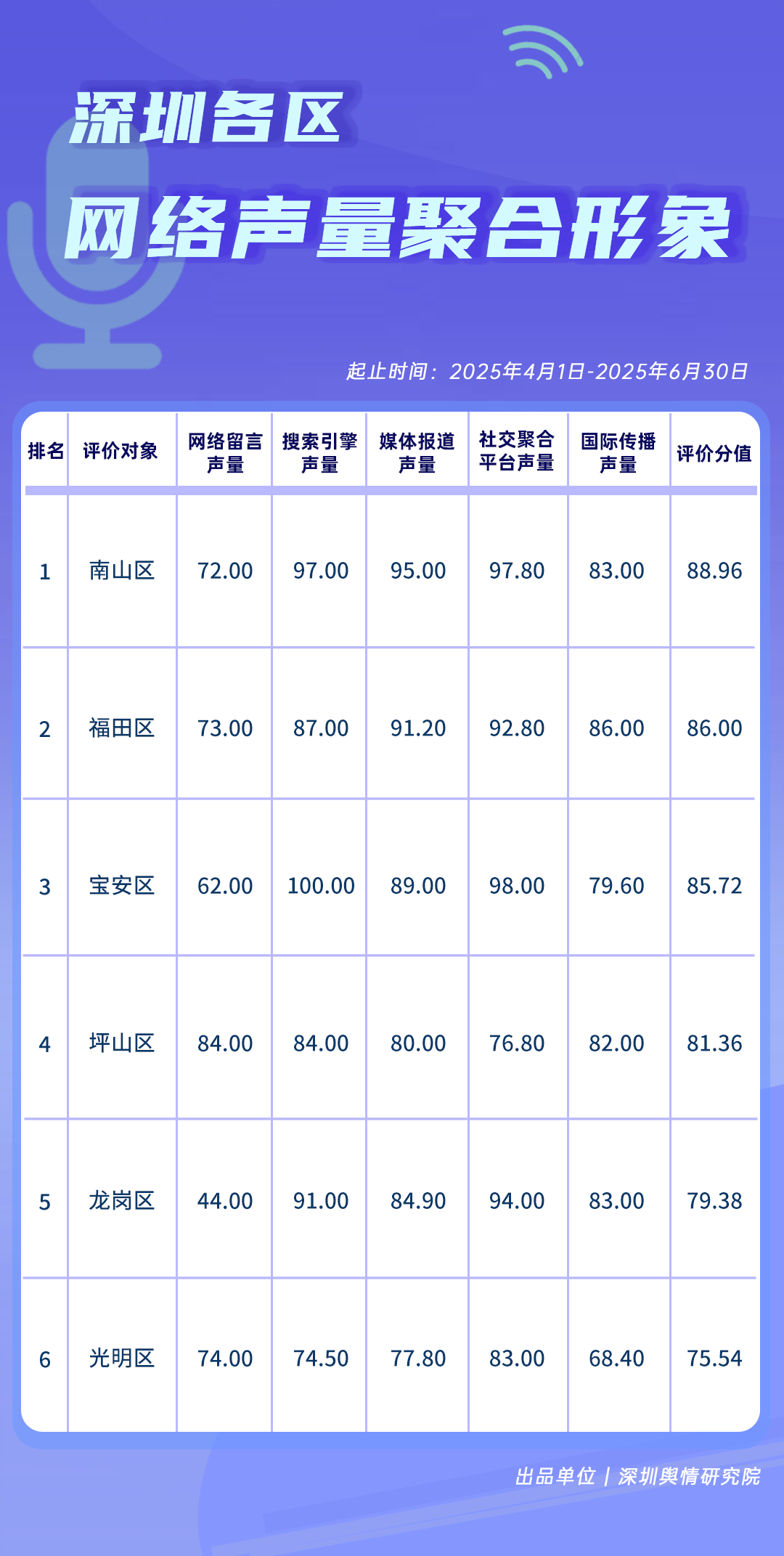 4-6月,《深圳各區(qū)網(wǎng)絡聲量聚合形象榜》中,南山區(qū)憑借各項聲量指標的優(yōu)異表現(xiàn),以88.96分榮登榜首,福田區(qū)、寶安區(qū)緊隨其后,在搜索引擎聲量、媒體報道聲量等指標上均斬獲高分,反映出市民及媒體對區(qū)域給予較高關注。坪山區(qū)、龍崗區(qū)、光明區(qū)也位居前列,表現(xiàn)不俗,為提升城市數(shù)字治理能級注入了源源不斷的動力。
