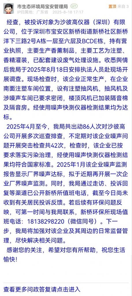 經(jīng)查,被投訴對象為沙彼高儀器(深圳)有限公司,位于深圳市寶安區(qū)新橋街道新橋社區(qū)新橋洋下三路2號A棟一層至六層及BCDE棟,持有營業(yè)執(zhí)照,主要生產(chǎn)香薰制品,主要工藝為注塑、香精灌裝,已配套建設(shè)廢氣處理設(shè)施。收悉輿情后我局于2025年8月18日安排執(zhí)法人員赴現(xiàn)場開展調(diào)查?,F(xiàn)場檢查時,該企業(yè)正常生產(chǎn),在企業(yè)南面注塑車間位置,設(shè)有注塑抽風機,抽風機及涉噪聲車間已要求密閉,樓頂風機已加裝隔音棉及隔音房。經(jīng)使用噪聲快測儀器檢測結(jié)果均為達標。
