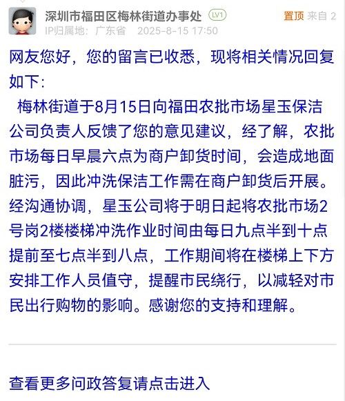 網(wǎng)友您好,您的留言已收悉,現(xiàn)將相關(guān)情況回復如下:梅林街道于8月15日向福田農(nóng)批市場星玉保潔公司負責人反饋了您的意見建議,經(jīng)了解,農(nóng)批市場每日早晨六點為商戶卸貨時間,會造成地面臟污,因此沖洗保潔工作需在商戶卸貨后開展。經(jīng)溝通協(xié)調(diào),星玉公司將于明日起將農(nóng)批市場2號崗2樓樓梯沖洗作業(yè)時間由每日九點半到十點提前至七點半到八點,工作期間將在樓梯上下方安排工作人員值守,提醒市民繞行,以減輕對市民出行購物的影響。感謝您的支持和理解。