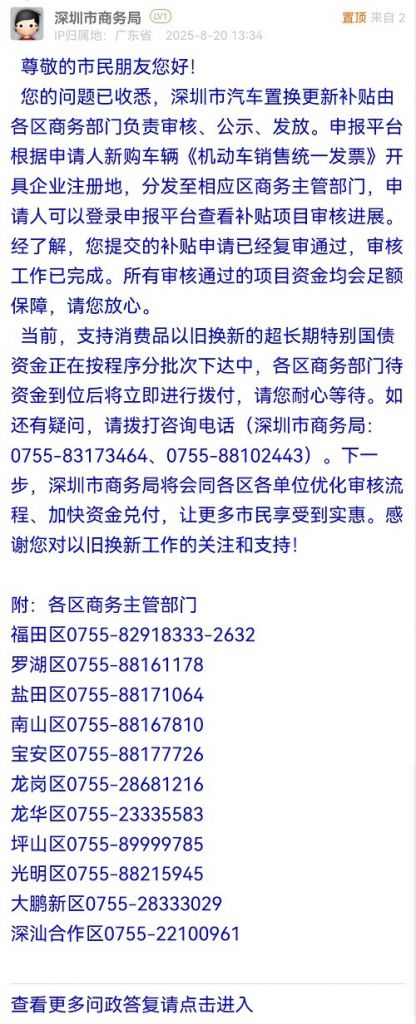 您的問題已收悉,深圳市汽車置換更新補貼由各區(qū)商務部門負責審核、公示、發(fā)放。申報平臺根據(jù)申請人新購車輛《機動車銷售統(tǒng)一發(fā)票》開具企業(yè)注冊地,分發(fā)至相應區(qū)商務主管部門,申請人可以登錄申報平臺查看補貼項目審核進展。經(jīng)了解,您提交的補貼申請已經(jīng)復審通過,審核工作已完成。所有審核通過的項目資金均會足額保障,請您放心。
