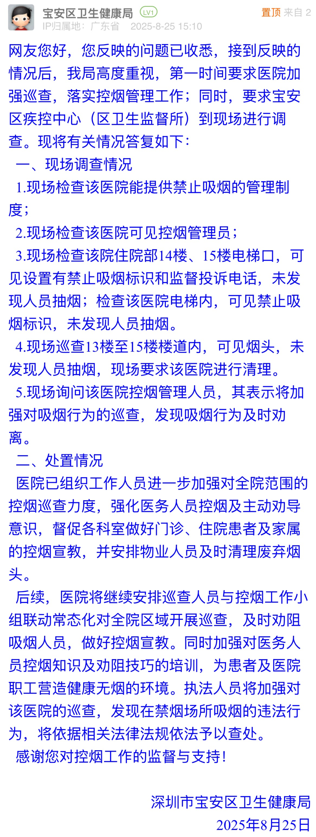 優(yōu)化建議:接到市民反饋后,寶安區(qū)衛(wèi)生健康局快速組織現場調查,核實醫(yī)院有禁煙制度、控煙管理員在崗,基礎控煙措施核查到位,值得點贊。但回應中多次強調“未發(fā)現人員抽煙”,回避對歷史吸煙行為處置、煙頭來源及勸阻機制失效的解釋,與市民關切脫節(jié),難以消除市民對醫(yī)院日??責熌芰Φ膿鷳n,建議完善具體控煙措施,如加裝煙感報警裝置,建立核查公示制度等,筑牢“無煙醫(yī)院”防線。