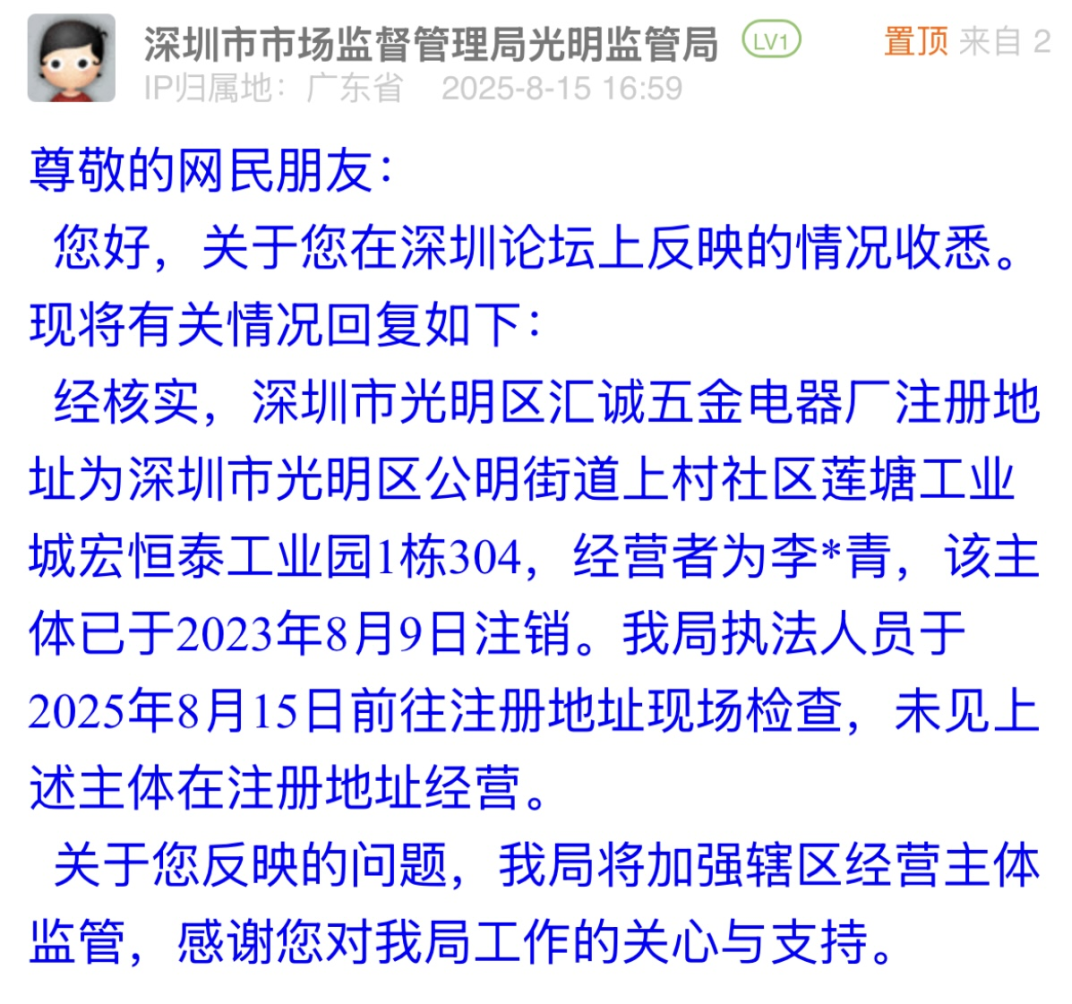 優(yōu)化建議:深圳市市場監(jiān)督管理局光明管理局的回應中,核實了涉事電器廠已注銷,且不在注冊地經營,也提及加強轄區(qū)主體監(jiān)管,但市民反映的排插套用注銷主體信息銷售、違規(guī)標識3C標志等關鍵問題,未得到明確解答。若回應中能豐富指引類內容,如告知市民可向平臺追責的途徑、提交證據的具體方式,為市民維權提供清晰方向,將更貼合市民需求,也能讓回應更具實際意義。