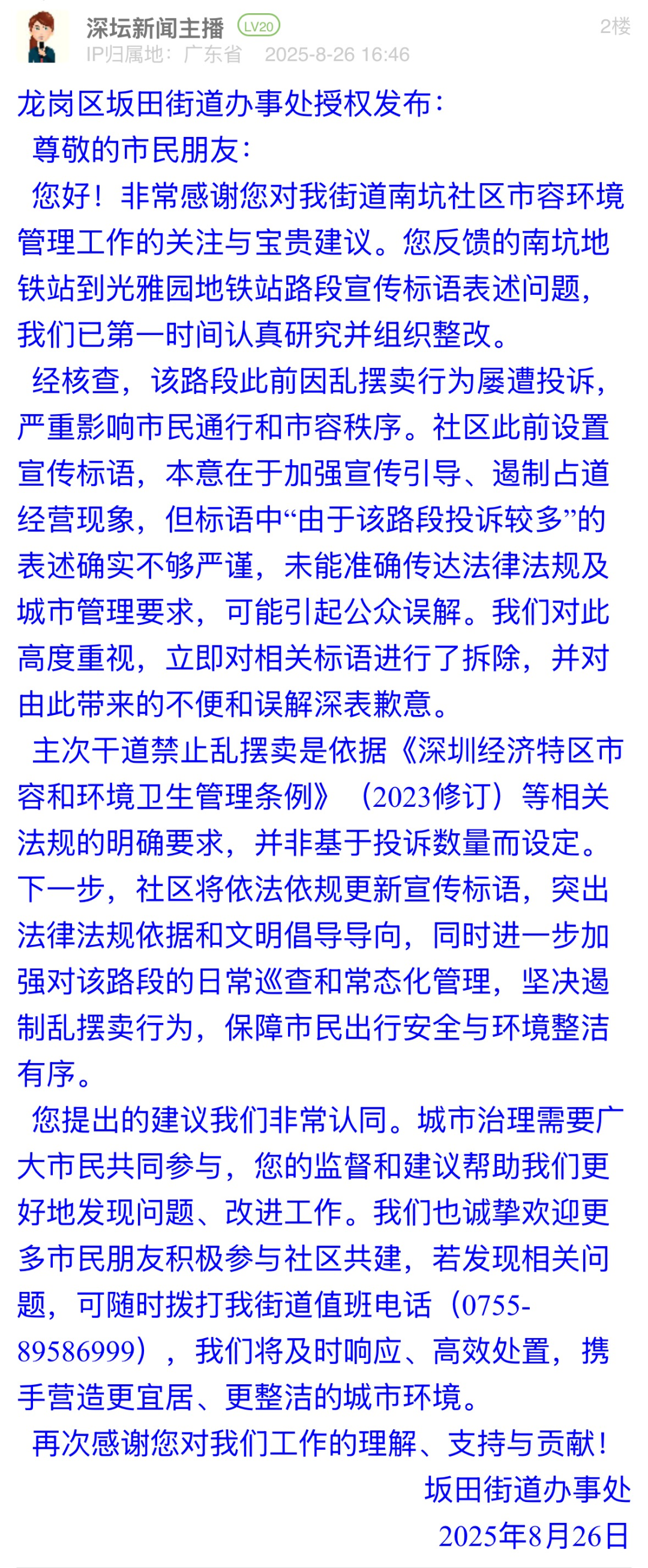 案例點評:標語表述不嚴謹可能引發(fā)公眾誤解,坂田街道辦展現出高效務實的態(tài)度,第一時間拆除涉事標語,計劃更新標語,明確標語中提及的禁擺依據為法規(guī)要求而非投訴數量。回應中,街道主動致歉并公開整改邏輯,展現“直面問題不推諉”的擔當,更以“邀請市民參與共建”為切入點,構建“政府主導+公眾監(jiān)督”的治理閉環(huán)。此次整改有效化解因標語表述不當引發(fā)的公眾疑慮,彰顯了“以民為師”的共治智慧。