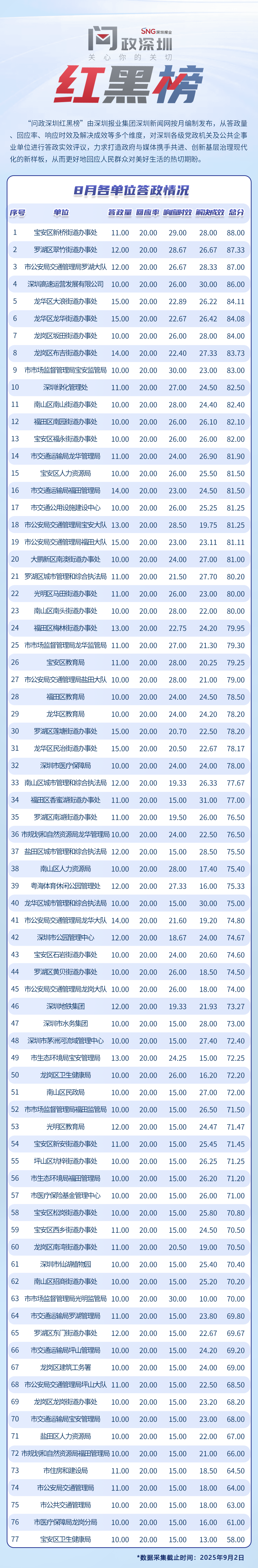 為探尋媒體如何精準賦能基層治理現代化的“深圳路徑”,深圳報業(yè)集團正式掛牌成立“問政深圳”工作室,旨在進一步推動網絡問政工作的高效開展。為確保相關工作更加契合實際需求,自上期起,深圳報業(yè)集團深圳新聞網按照“最快速度辦結”的總體要求,將原有月度榜單創(chuàng)新升級為“問政深圳紅黑榜”,并對評分體系進行了細致優(yōu)化。該榜單從答政量、回應率、響應時效及解決成效等多個維度,對深圳各級黨政機關及公共企事業(yè)單位進行答政實效評議,力求打造政府與媒體攜手共進、創(chuàng)新基層治理現代化的新樣板,從而更好地回應人民群眾對美好生活的熱切期盼。