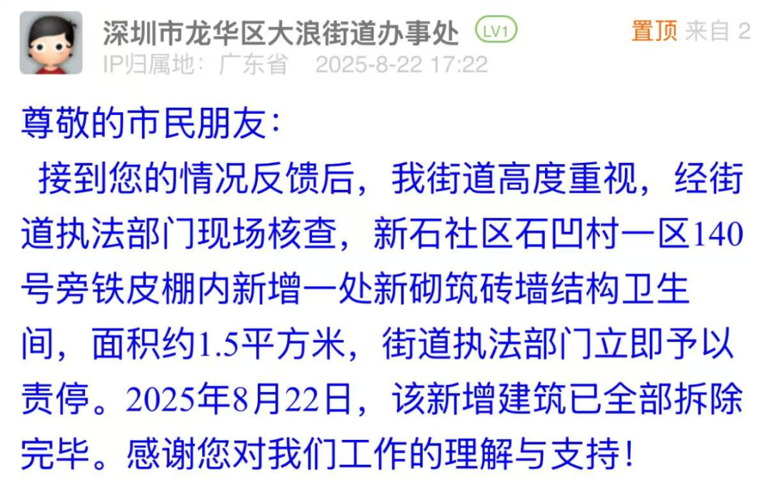 案例點評:8月21日晚間,市民發(fā)布帖文反映違建問題,大浪街道以“雷霆處置”展現安全至上的治理擔當。接到投訴后,街道迅速核查,在22日給出回應,表示已完成拆除工作,做到了“速辦速結,質效雙優(yōu)”。此次響應既體現“隱患即事故”的底線思維,更以“發(fā)現即拆除”的高效行動,彰顯基層治理對民生安全的敏銳感知與果斷處置能力,切實筑牢居民“身邊安全”防線。