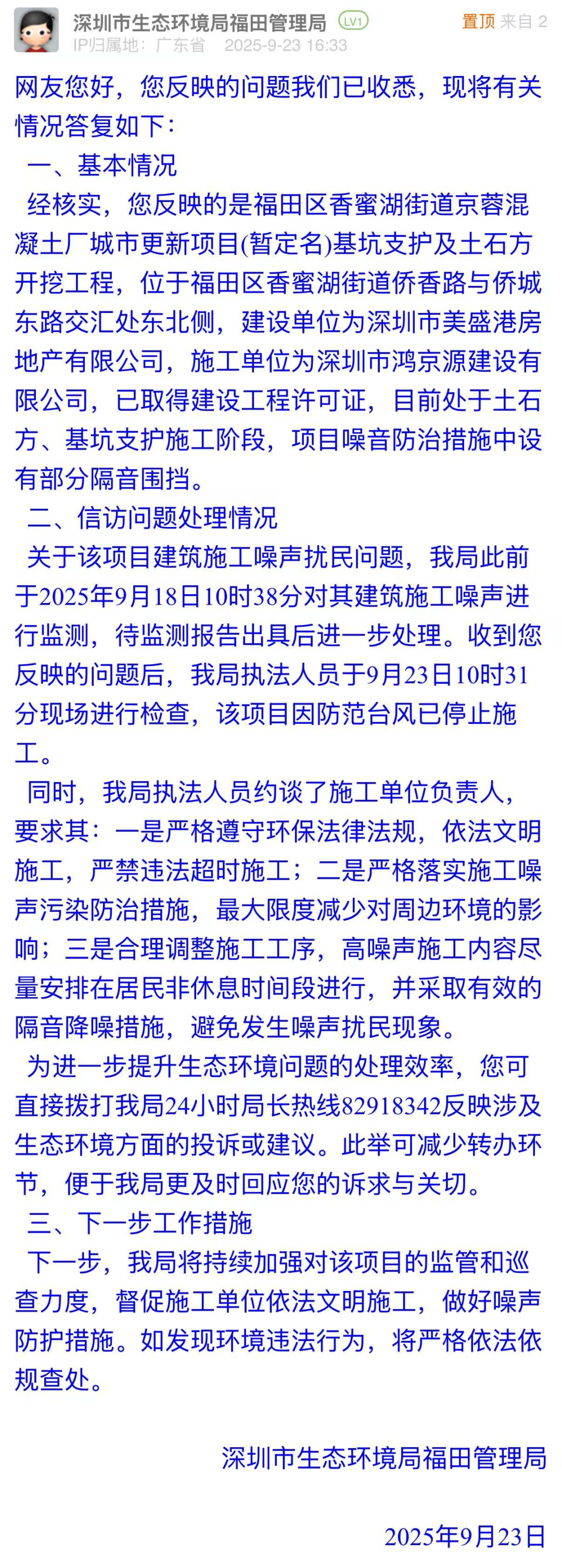 優(yōu)化建議:在訴求中,市民表示施工噪音可以忍耐,但希望“灰塵大”情況可以得到緩解,并附圖展示現(xiàn)場情況。市生態(tài)環(huán)境局福田管理局在回應中,僅聚焦建筑施工噪聲,對“灰塵污染”只字未提,與市民訴求脫節(jié)。建議后續(xù)提高訴求匹配度,用務實的態(tài)度回應市民對居住環(huán)境、城市建設的關切,避免因回應不完整引發(fā)新的治理信任問題。
